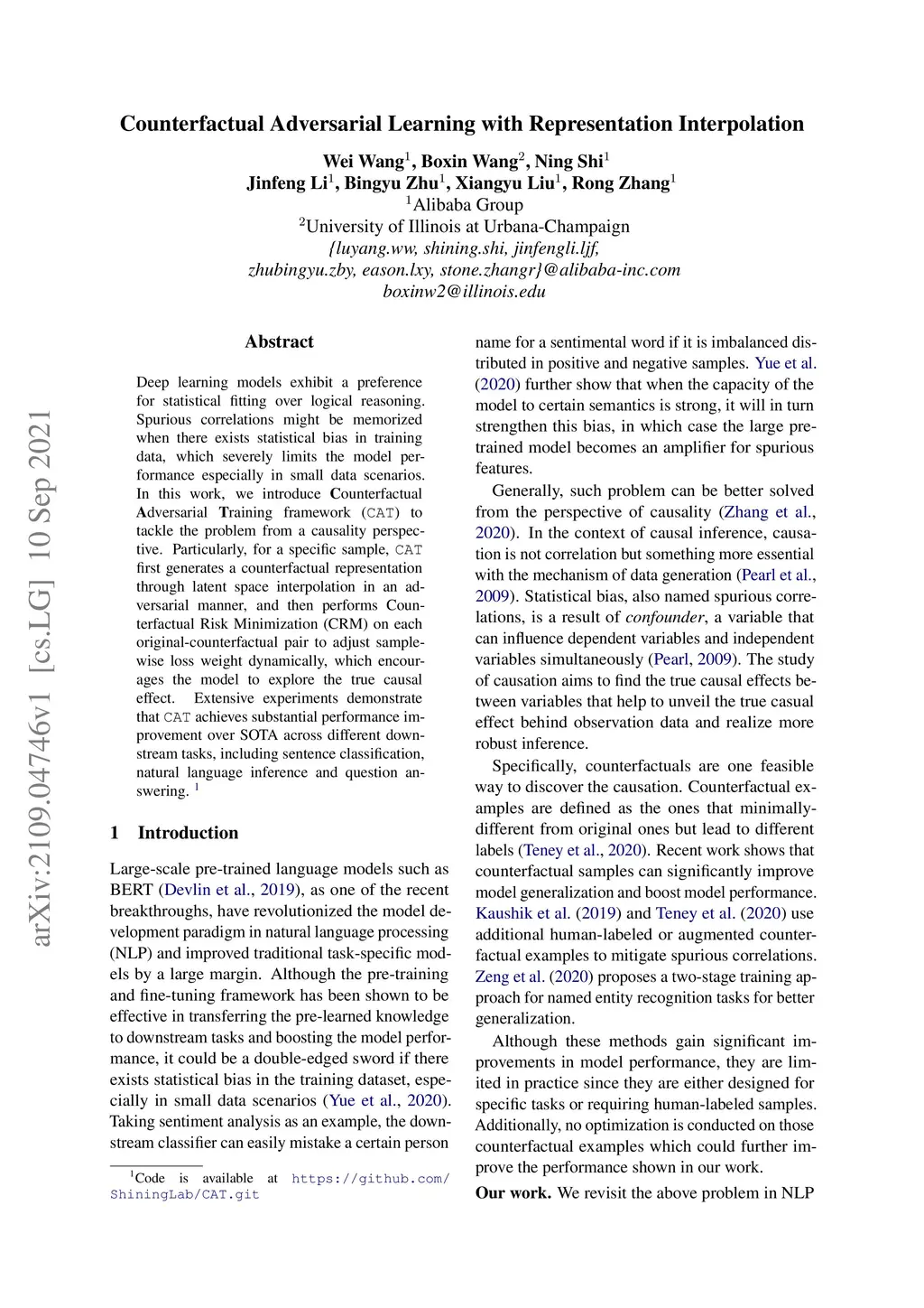 Deep learning models exhibit a preference for statistical fitting over logical reasoning. Spurious correlations might be memorized when there exists statistical bias in training data, which severely limits the model performance especially in small data scenarios. In this work, we introduce Counterfactual Adversarial Training framework (CAT) to tackle the problem from a causality perspective. Particularly, for a specific sample, CAT first generates a counterfactual representation through latent space interpolation in an adversarial manner, and then performs Counterfactual Risk Minimization (CRM) on each original-counterfactual pair to adjust sample-wise loss weight dynamically, which encourages the model to explore the true causal effect. Extensive experiments demonstrate that CAT achieves substantial performance improvement over SOTA across different downstream tasks, including sentence classification, natural language inference and question answering.