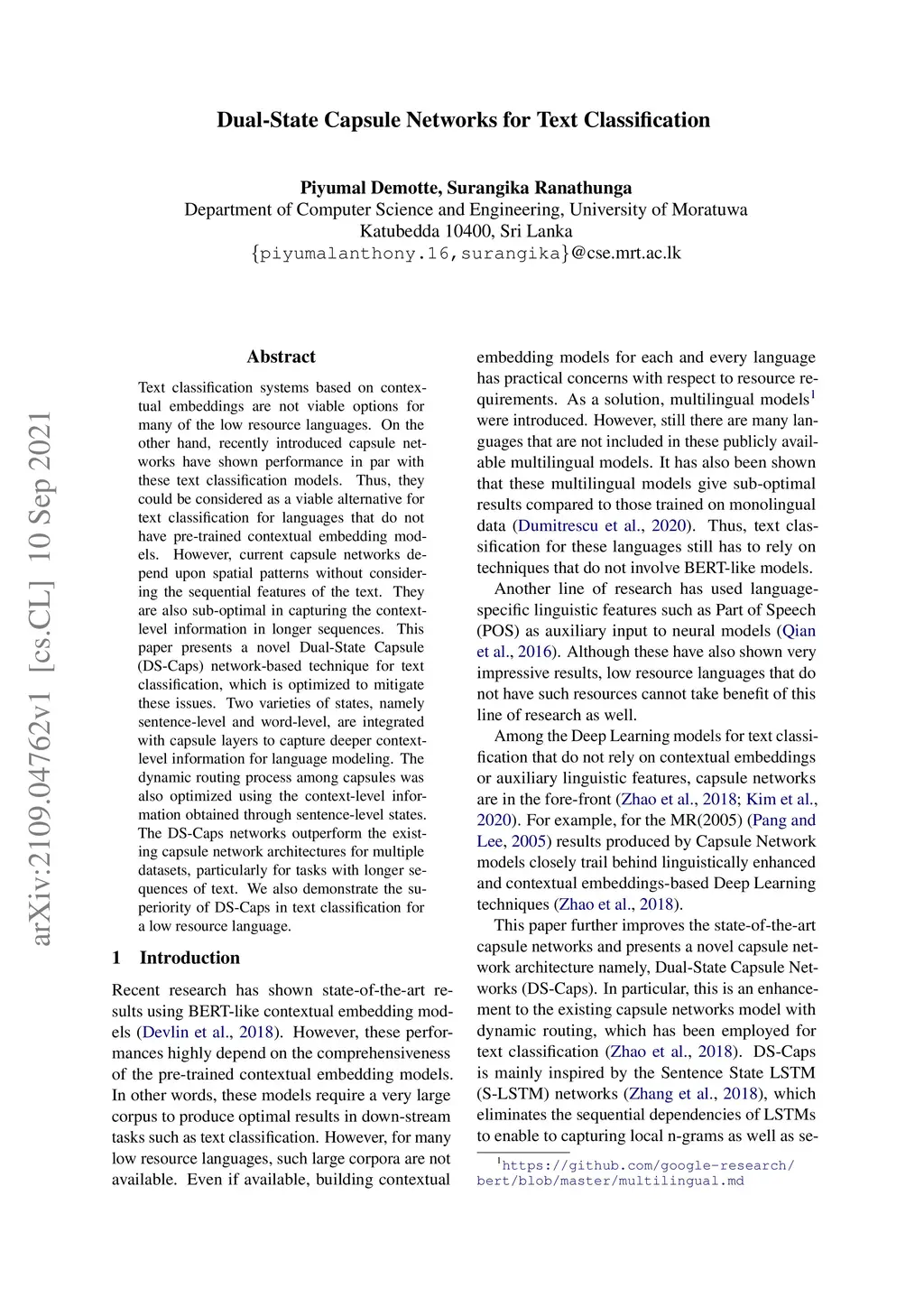 Text classification systems based on contextual embeddings are not viable options for many of the low resource languages. On the other hand, recently introduced capsule networks have shown performance in par with these text classification models. Thus, they could be considered as a viable alternative for text classification for languages that do not have pre-trained contextual embedding models. However, current capsule networks depend upon spatial patterns without considering the sequential features of the text. They are also sub-optimal in capturing the context-level information in longer sequences. This paper presents a novel Dual-State Capsule (DS-Caps) network-based technique for text classification, which is optimized to mitigate these issues. Two varieties of states, namely sentence-level and word-level, are integrated with capsule layers to capture deeper context-level information for language modeling. The dynamic routing process among capsules was also optimized using the context-level information obtained through sentence-level states. The DS-Caps networks outperform the existing capsule network architectures for multiple datasets, particularly for tasks with longer sequences of text. We also demonstrate the superiority of DS-Caps in text classification for a low resource language.