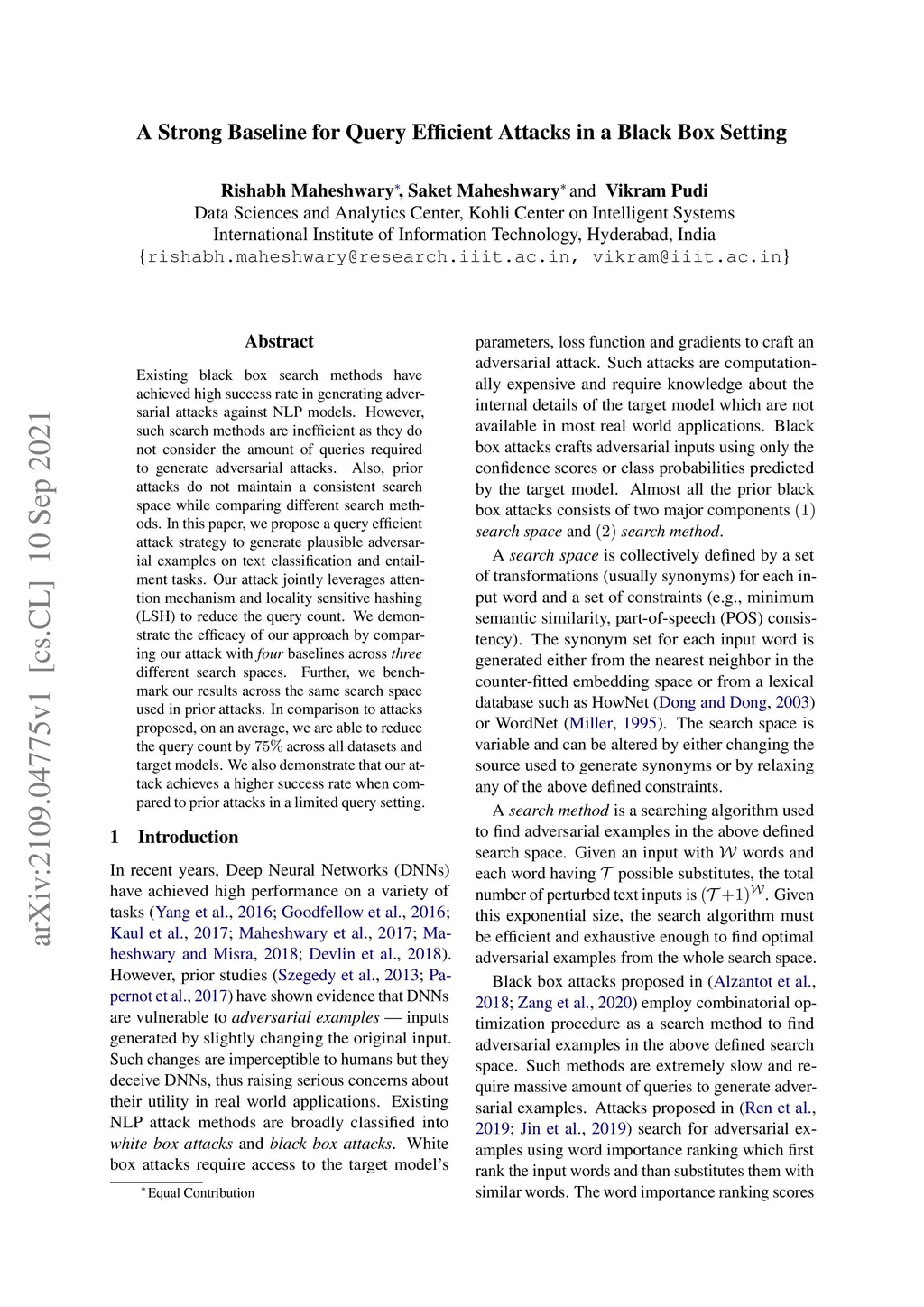 Existing black box search methods have achieved high success rate in generating adversarial attacks against NLP models. However, such search methods are inefficient as they do not consider the amount of queries required to generate adversarial attacks. Also, prior attacks do not maintain a consistent search space while comparing different search methods. In this paper, we propose a query efficient attack strategy to generate plausible adversarial examples on text classification and entailment tasks. Our attack jointly leverages attention mechanism and locality sensitive hashing (LSH) to reduce the query count. We demonstrate the efficacy of our approach by comparing our attack with four baselines across three different search spaces. Further, we benchmark our results across the same search space used in prior attacks. In comparison to attacks proposed, on an average, we are able to reduce the query count by 75% across all datasets and target models. We also demonstrate that our attack achieves a higher success rate when compared to prior attacks in a limited query setting.