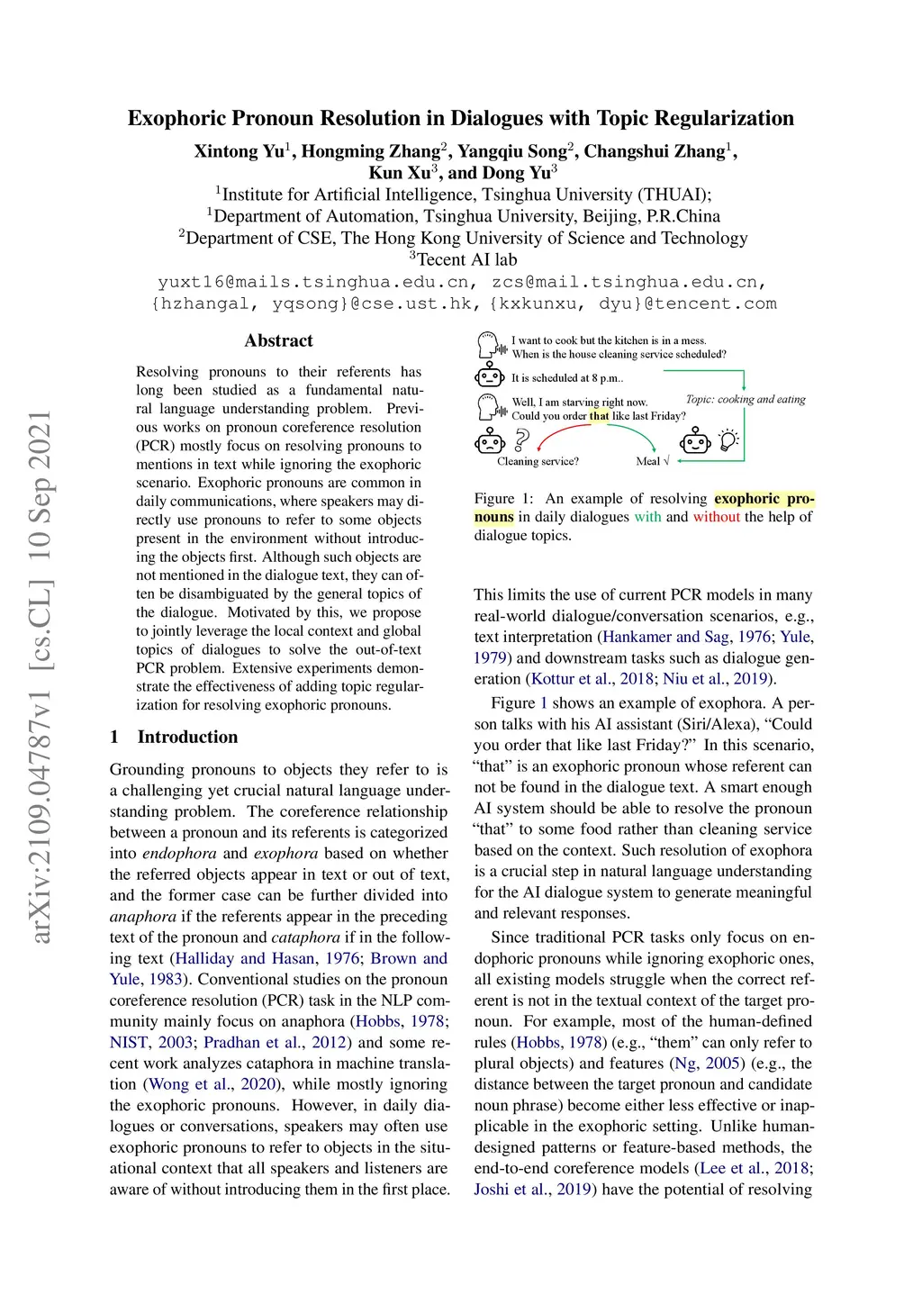 Exophoric Pronoun Resolution in Dialogues with Topic Regularization