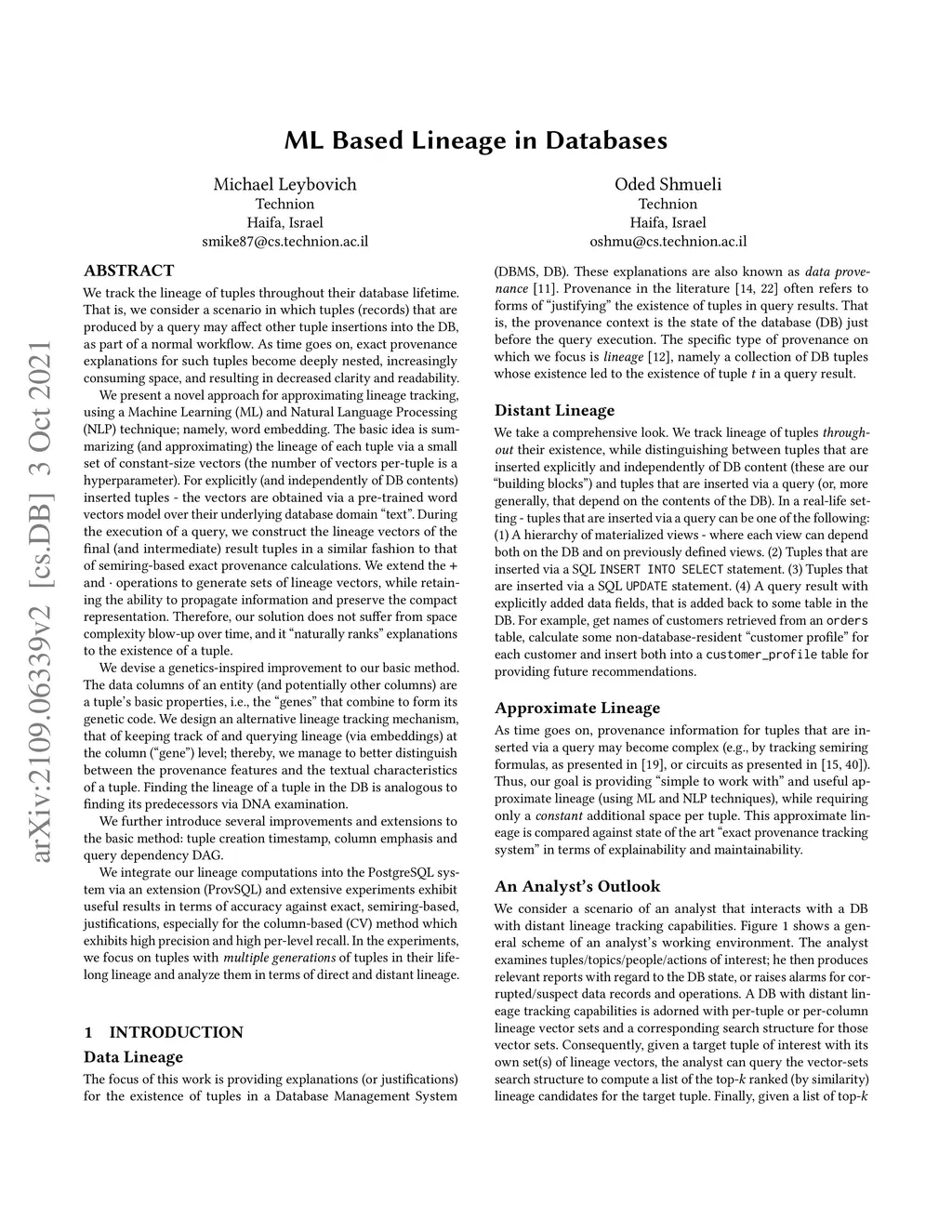 We track the lineage of tuples throughout their database lifetime. That is, we consider a scenario in which tuples (records) that are produced by a query may affect other tuple insertions into the DB, as part of a normal workflow. As time goes on, exact provenance explanations for such tuples become deeply nested, increasingly consuming space, and resulting in decreased clarity and readability. We present a novel approach for approximating lineage tracking, using a Machine Learning (ML) and Natural Language Processing (NLP) technique; namely, word embedding. The basic idea is summarizing (and approximating) the lineage of each tuple via a small set of constant-size vectors (the number of vectors per-tuple is a hyperparameter). Therefore, our solution does not suffer from space complexity blow-up over time, and it "naturally ranks" explanations to the existence of a tuple. We devise an alternative and improved lineage tracking mechanism, that of keeping track of and querying lineage at the column level; thereby, we manage to better distinguish between the provenance features and the textual characteristics of a tuple. We integrate our lineage computations into the PostgreSQL system via an extension (ProvSQL) and extensive experiments exhibit useful results in terms of accuracy against exact, semiring-based, justifications, especially for the column-based (CV) method which exhibits high precision and high per-level recall. In the experiments, we focus on tuples with \textit{multiple generations} of tuples in their lifelong lineage and analyze them in terms of direct and distant lineage.