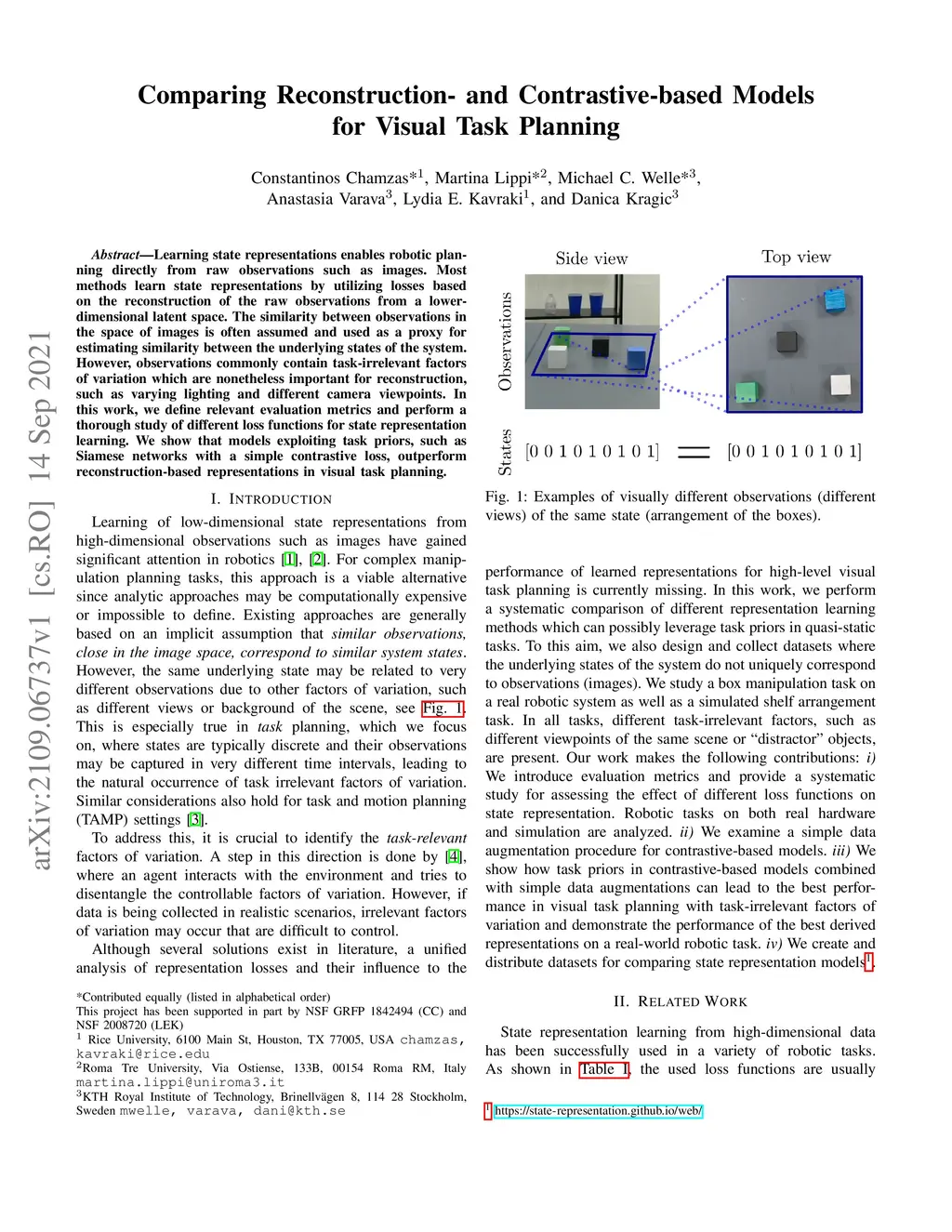 Learning state representations enables robotic planning directly from raw observations such as images. Most methods learn state representations by utilizing losses based on the reconstruction of the raw observations from a lower-dimensional latent space. The similarity between observations in the space of images is often assumed and used as a proxy for estimating similarity between the underlying states of the system. However, observations commonly contain task-irrelevant factors of variation which are nonetheless important for reconstruction, such as varying lighting and different camera viewpoints. In this work, we define relevant evaluation metrics and perform a thorough study of different loss functions for state representation learning. We show that models exploiting task priors, such as Siamese networks with a simple contrastive loss, outperform reconstruction-based representations in visual task planning.