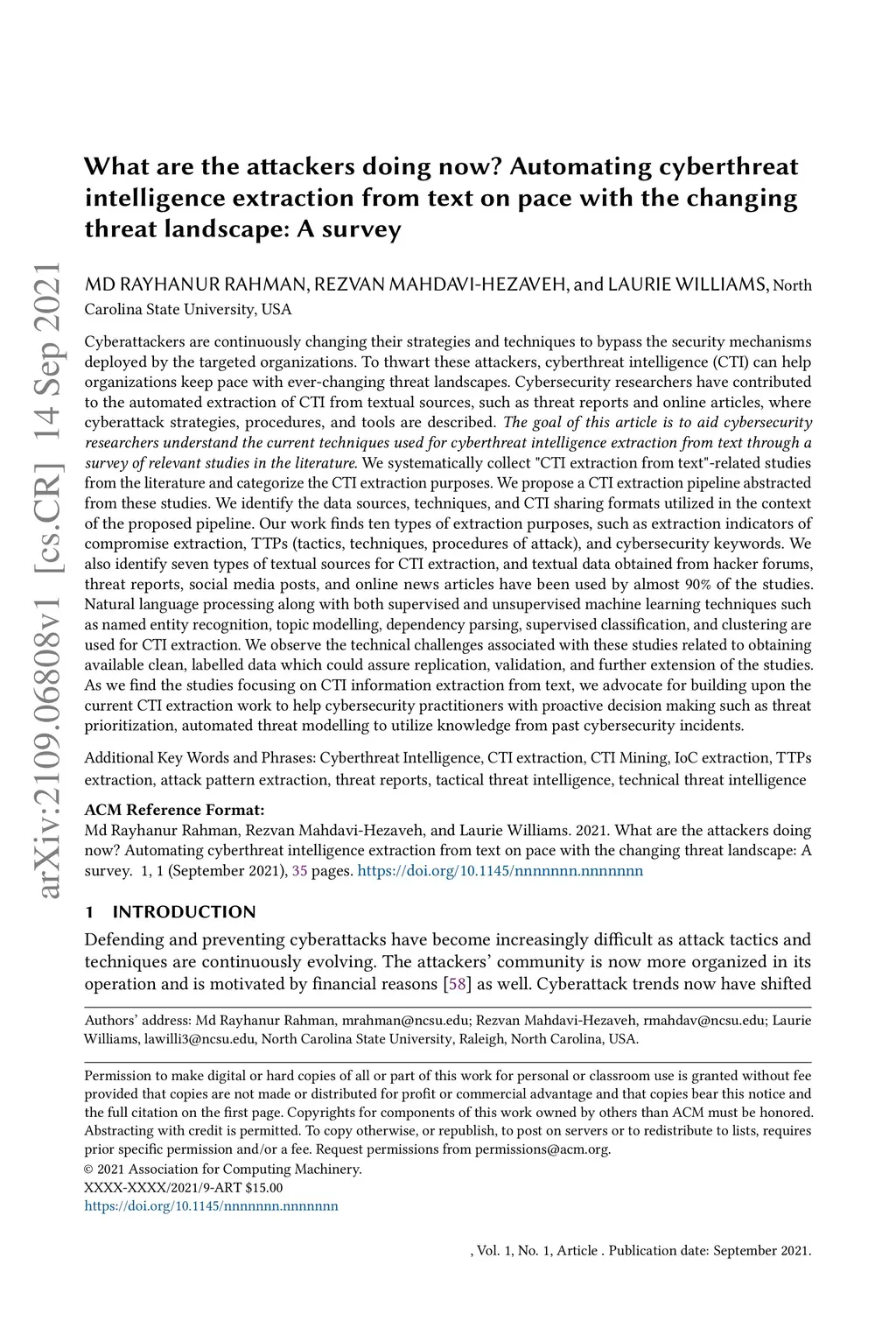 Cybersecurity researchers have contributed to the automated extraction of CTI from textual sources, such as threat reports and online articles, where cyberattack strategies, procedures, and tools are described. The goal of this article is to aid cybersecurity researchers understand the current techniques used for cyberthreat intelligence extraction from text through a survey of relevant studies in the literature. We systematically collect "CTI extraction from text"-related studies from the literature and categorize the CTI extraction purposes. We propose a CTI extraction pipeline abstracted from these studies. We identify the data sources, techniques, and CTI sharing formats utilized in the context of the proposed pipeline. Our work finds ten types of extraction purposes, such as extraction indicators of compromise extraction, TTPs (tactics, techniques, procedures of attack), and cybersecurity keywords. We also identify seven types of textual sources for CTI extraction, and textual data obtained from hacker forums, threat reports, social media posts, and online news articles have been used by almost 90% of the studies. Natural language processing along with both supervised and unsupervised machine learning techniques such as named entity recognition, topic modelling, dependency parsing, supervised classification, and clustering are used for CTI extraction. We observe the technical challenges associated with these studies related to obtaining available clean, labelled data which could assure replication, validation, and further extension of the studies. As we find the studies focusing on CTI information extraction from text, we advocate for building upon the current CTI extraction work to help cybersecurity practitioners with proactive decision making such as threat prioritization, automated threat modelling to utilize knowledge from past cybersecurity incidents.