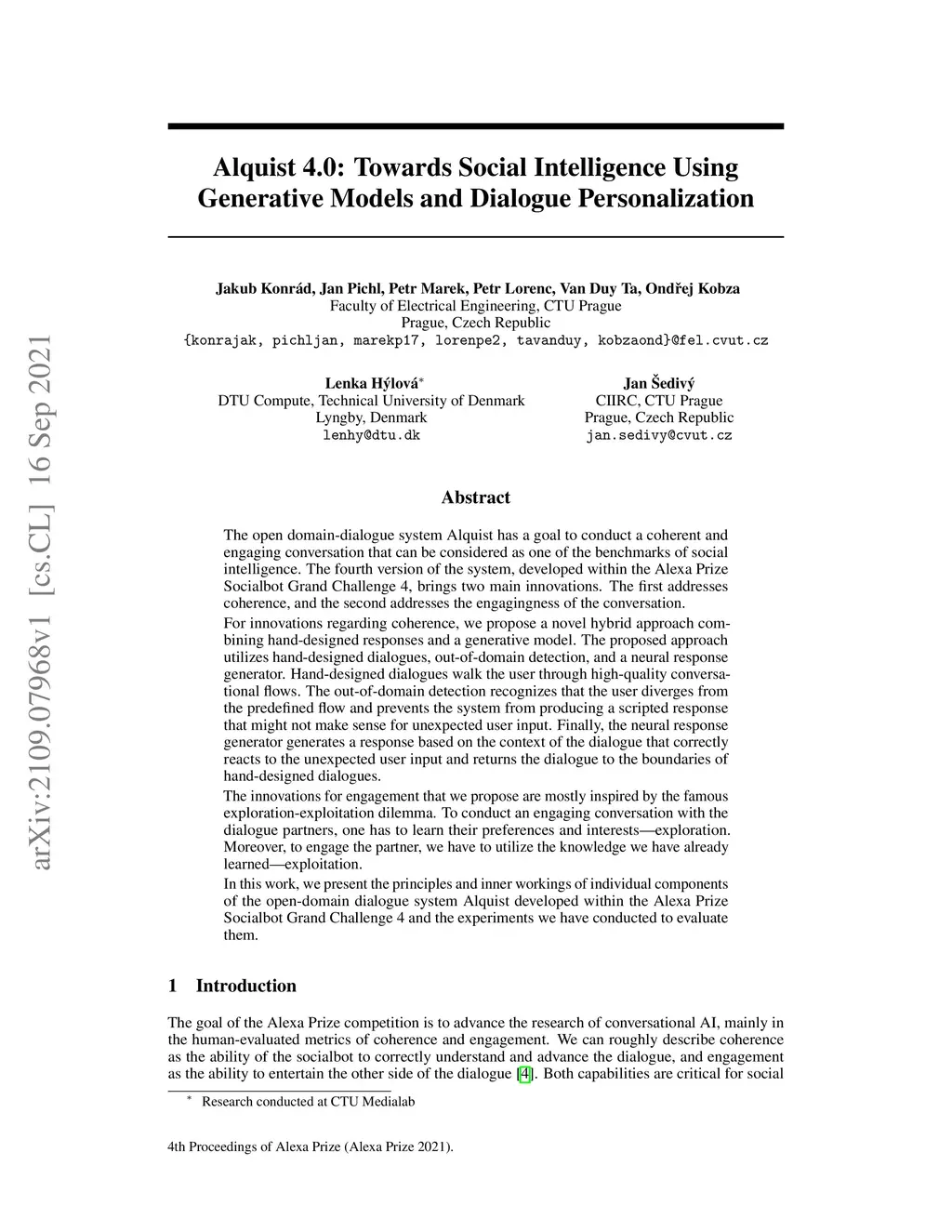 The open domain-dialogue system Alquist has a goal to conduct a coherent and engaging conversation that can be considered as one of the benchmarks of social intelligence. The fourth version of the system, developed within the Alexa Prize Socialbot Grand Challenge 4, brings two main innovations. The first addresses coherence, and the second addresses the engagingness of the conversation. For innovations regarding coherence, we propose a novel hybrid approach combining hand-designed responses and a generative model. The proposed approach utilizes hand-designed dialogues, out-of-domain detection, and a neural response generator. Hand-designed dialogues walk the user through high-quality conversational flows. The out-of-domain detection recognizes that the user diverges from the predefined flow and prevents the system from producing a scripted response that might not make sense for unexpected user input. Finally, the neural response generator generates a response based on the context of the dialogue that correctly reacts to the unexpected user input and returns the dialogue to the boundaries of hand-designed dialogues. The innovations for engagement that we propose are mostly inspired by the famous exploration-exploitation dilemma. To conduct an engaging conversation with the dialogue partners, one has to learn their preferences and interests -- exploration. Moreover, to engage the partner, we have to utilize the knowledge we have already learned -- exploitation. In this work, we present the principles and inner workings of individual components of the open-domain dialogue system Alquist developed within the Alexa Prize Socialbot Grand Challenge 4 and the experiments we have conducted to evaluate them.