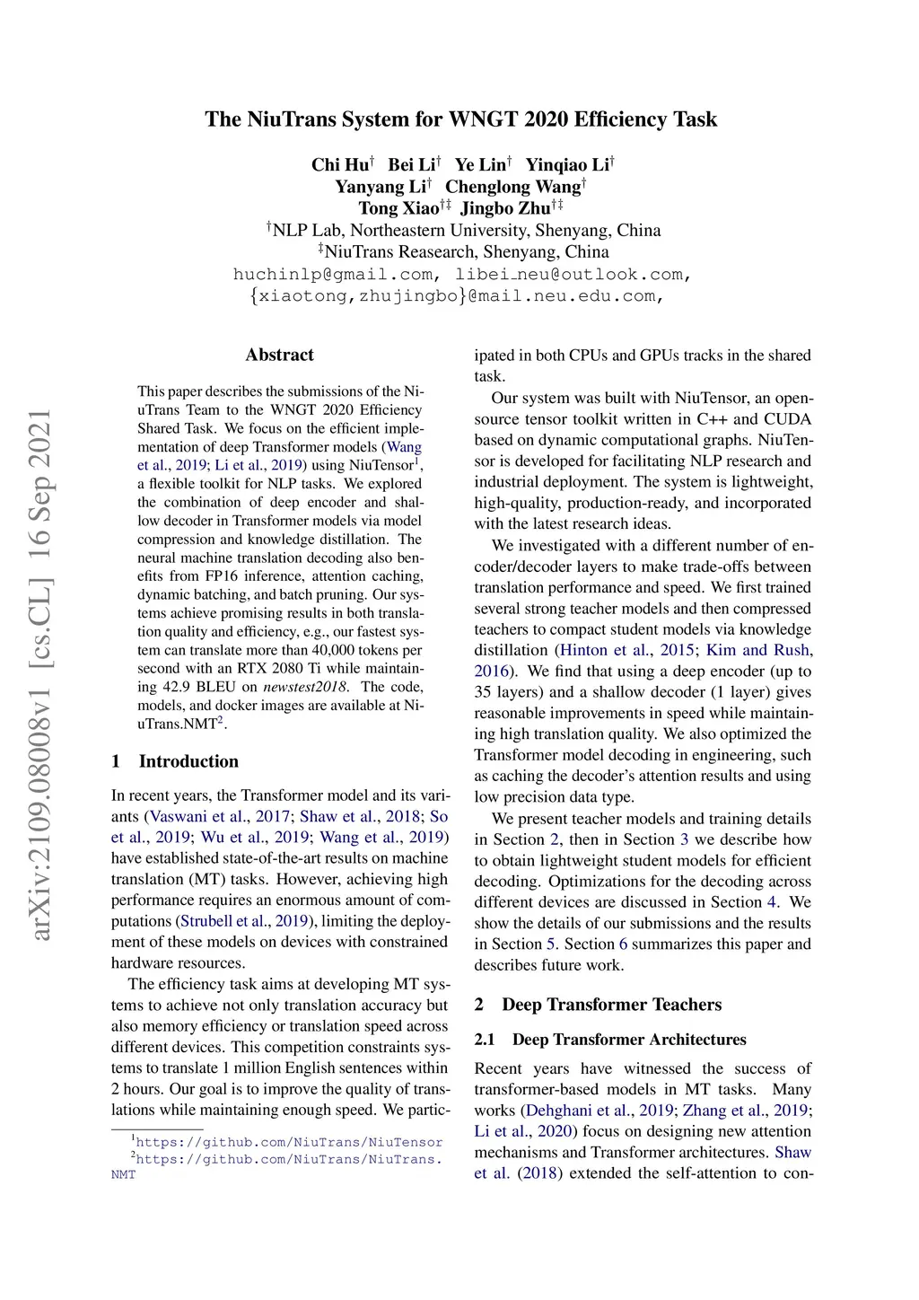 The NiuTrans System for WNGT 2020 Efficiency Task