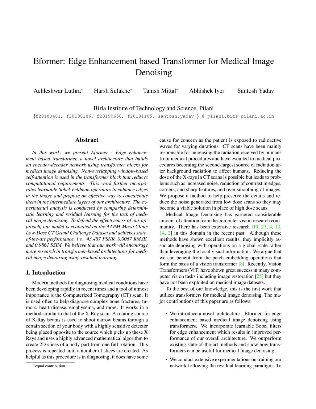 In this work, we present Eformer - Edge enhancement based transformer, a novel architecture that builds an encoder-decoder network using transformer blocks for medical image denoising. Non-overlapping window-based self-attention is used in the transformer block that reduces computational requirements. This work further incorporates learnable Sobel-Feldman operators to enhance edges in the image and propose an effective way to concatenate them in the intermediate layers of our architecture. The experimental analysis is conducted by comparing deterministic learning and residual learning for the task of medical image denoising. To defend the effectiveness of our approach, our model is evaluated on the AAPM-Mayo Clinic Low-Dose CT Grand Challenge Dataset and achieves state-of-the-art performance, , 43.487 PSNR, 0.0067 RMSE, and 0.9861 SSIM. We believe that our work will encourage more research in transformer-based architectures for medical image denoising using residual learning.