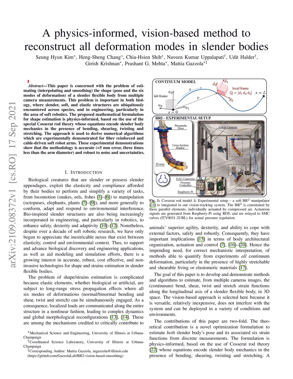 This paper is concerned with the problem of estimating (interpolating and smoothing) the shape (pose and the six modes of deformation) of a slender flexible body from multiple camera measurements. This problem is important in both biology, where slender, soft, and elastic structures are ubiquitously encountered across species, and in engineering, particularly in the area of soft robotics. The proposed mathematical formulation for shape estimation is physics-informed, based on the use of the special Cosserat rod theory whose equations encode slender body mechanics in the presence of bending, shearing, twisting and stretching. The approach is used to derive numerical algorithms which are experimentally demonstrated for fiber reinforced and cable-driven soft robot arms. These experimental demonstrations show that the methodology is accurate (<5 mm error, three times less than the arm diameter) and robust to noise and uncertainties.
