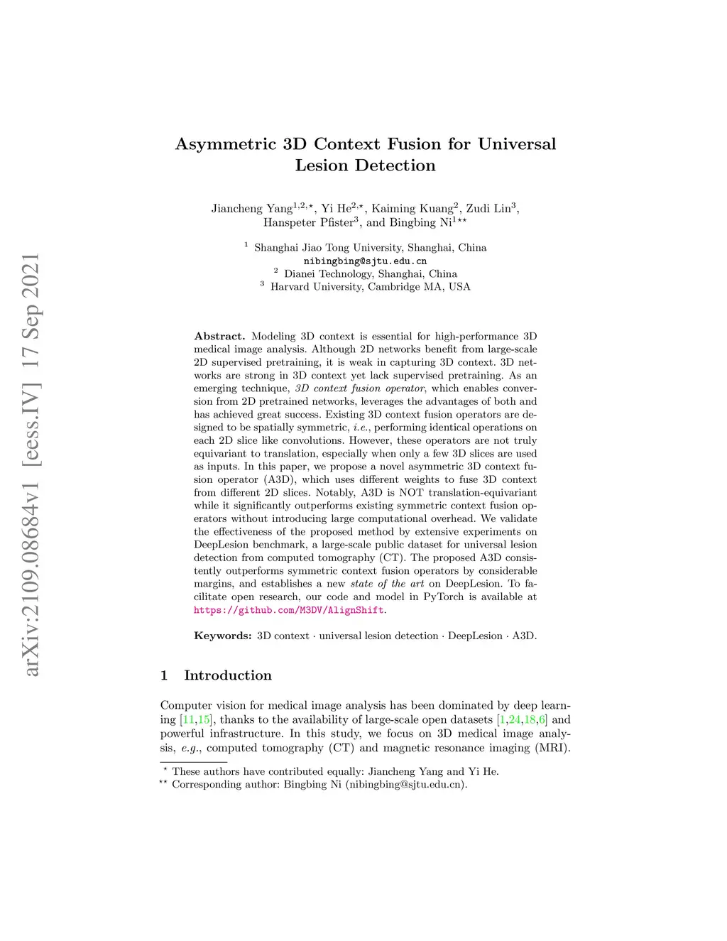Modeling 3D context is essential for high-performance 3D medical image analysis. Although 2D networks benefit from large-scale 2D supervised pretraining, it is weak in capturing 3D context. 3D networks are strong in 3D context yet lack supervised pretraining. As an emerging technique, \emph{3D context fusion operator}, which enables conversion from 2D pretrained networks, leverages the advantages of both and has achieved great success. Existing 3D context fusion operators are designed to be spatially symmetric, i.e., performing identical operations on each 2D slice like convolutions. However, these operators are not truly equivariant to translation, especially when only a few 3D slices are used as inputs. In this paper, we propose a novel asymmetric 3D context fusion operator (A3D), which uses different weights to fuse 3D context from different 2D slices. Notably, A3D is NOT translation-equivariant while it significantly outperforms existing symmetric context fusion operators without introducing large computational overhead. We validate the effectiveness of the proposed method by extensive experiments on DeepLesion benchmark, a large-scale public dataset for universal lesion detection from computed tomography (CT). The proposed A3D consistently outperforms symmetric context fusion operators by considerable margins, and establishes a new \emph{state of the art} on DeepLesion. To facilitate open research, our code and model in PyTorch are available at https://github.com/M3DV/AlignShift.