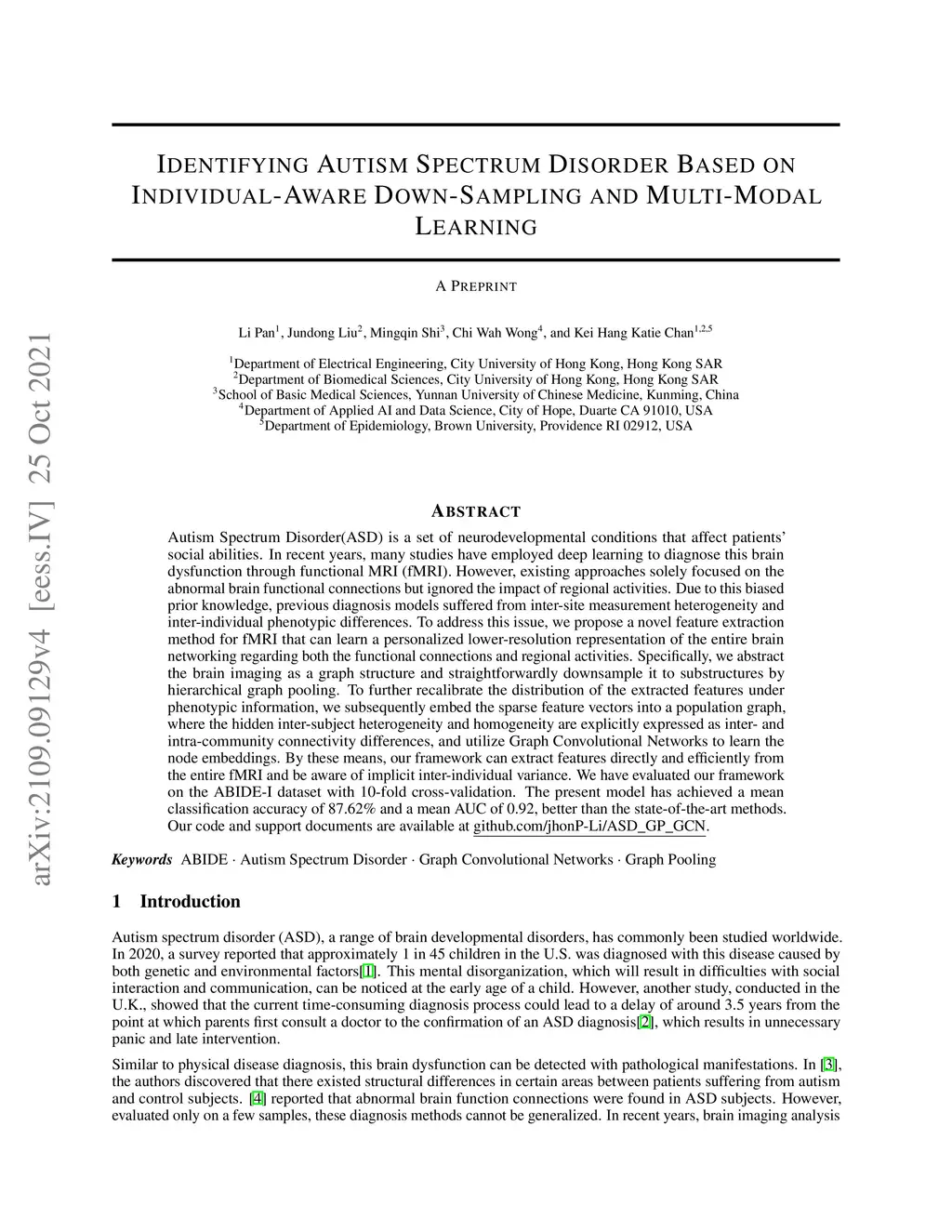 Autism Spectrum Disorder(ASD) is a set of neurodevelopmental conditions that affect patients' social abilities. In recent years, many studies have employed deep learning to diagnose this brain dysfunction through functional MRI (fMRI). However, existing approaches solely focused on the abnormal brain functional connections but ignored the impact of regional activities. Due to this biased prior knowledge, previous diagnosis models suffered from inter-site measurement heterogeneity and inter-individual phenotypic differences. To address this issue, we propose a novel feature extraction method for fMRI that can learn a personalized lower-resolution representation of the entire brain networking regarding both the functional connections and regional activities. Specifically, we abstract the brain imaging as a graph structure and straightforwardly downsample it to substructures by hierarchical graph pooling. To further recalibrate the distribution of the extracted features under phenotypic information, we subsequently embed the sparse feature vectors into a population graph, where the hidden inter-subject heterogeneity and homogeneity are explicitly expressed as inter- and intra-community connectivity differences, and utilize Graph Convolutional Networks to learn the node embeddings. By these means, our framework can extract features directly and efficiently from the entire fMRI and be aware of implicit inter-individual variance. We have evaluated our framework on the ABIDE-I dataset with 10-fold cross-validation. The present model has achieved a mean classification accuracy of 87.62\% and a mean AUC of 0.92, better than the state-of-the-art methods.
