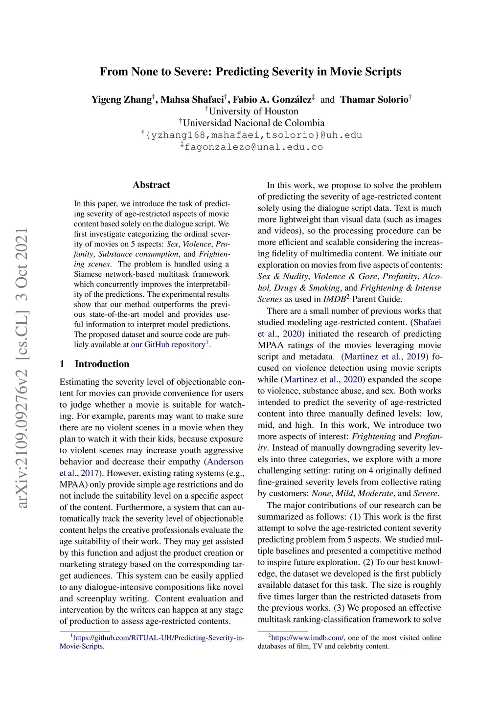 In this paper, we introduce the task of predicting severity of age-restricted aspects of movie content based solely on the dialogue script. We first investigate categorizing the ordinal severity of movies on 5 aspects: Sex, Violence, Profanity, Substance consumption, and Frightening scenes. The problem is handled using a siamese network-based multitask framework which concurrently improves the interpretability of the predictions. The experimental results show that our method outperforms the previous state-of-the-art model and provides useful information to interpret model predictions. The proposed dataset and source code are publicly available at our GitHub repository.