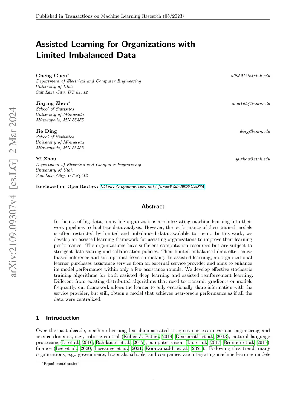 In the era of big data, many big organizations are integrating machine learning into their work pipelines to facilitate data analysis. However, the performance of their trained models is often restricted by limited and imbalanced data available to them. In this work, we develop an assisted learning framework for assisting organizations to improve their learning performance. The organizations have sufficient computation resources but are subject to stringent data-sharing and collaboration policies. Their limited imbalanced data often cause biased inference and sub-optimal decision-making. In assisted learning, an organizational learner purchases assistance service from an external service provider and aims to enhance its model performance within only a few assistance rounds. We develop effective stochastic training algorithms for both assisted deep learning and assisted reinforcement learning. Different from existing distributed algorithms that need to frequently transmit gradients or models, our framework allows the learner to only occasionally share information with the service provider, but still obtain a model that achieves near-oracle performance as if all the data were centralized.