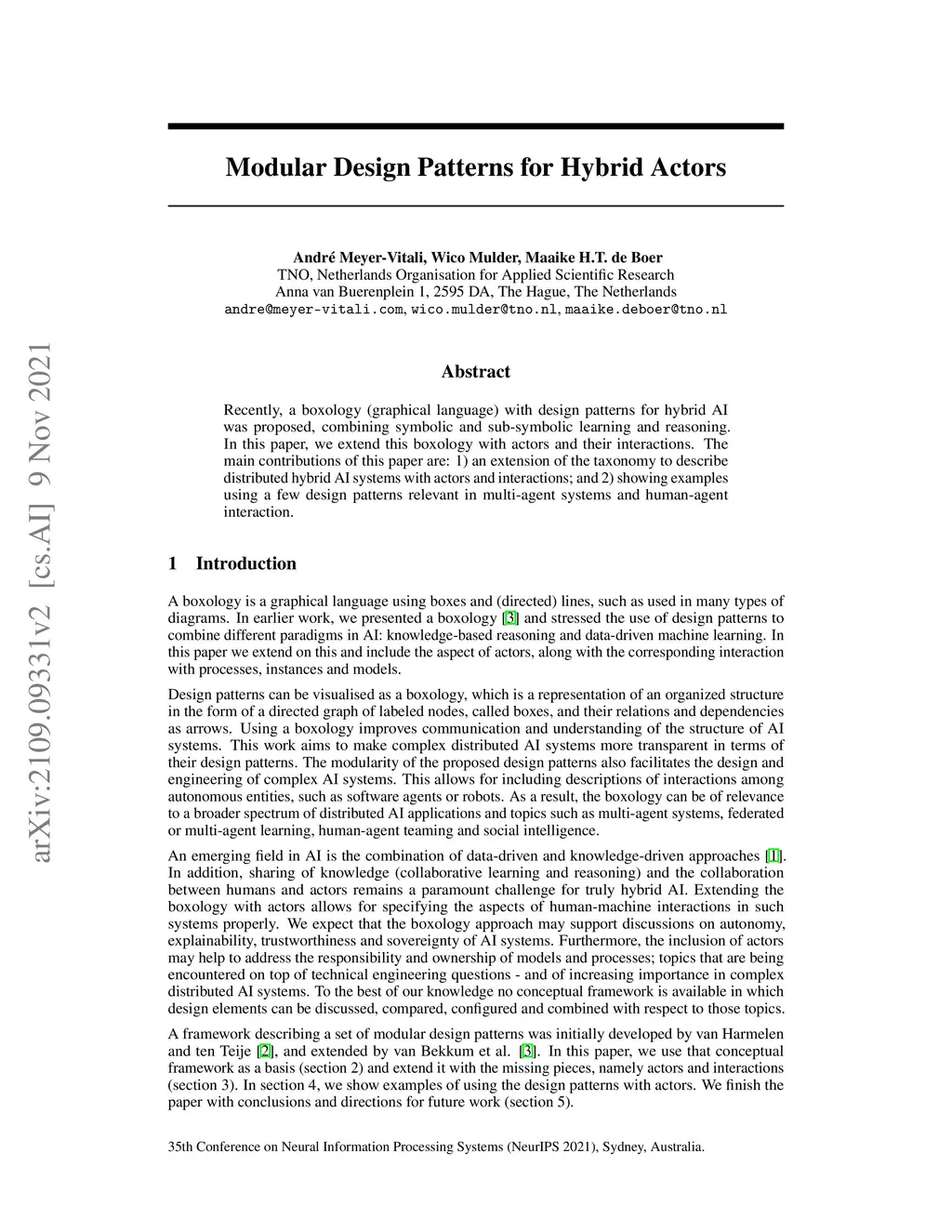 Recently, a boxology (graphical language) with design patterns for hybrid AI was proposed, combining symbolic and sub-symbolic learning and reasoning. In this paper, we extend this boxology with actors and their interactions. The main contributions of this paper are: 1) an extension of the taxonomy to describe distributed hybrid AI systems with actors and interactions; and 2) showing examples using a few design patterns relevant in multi-agent systems and human-agent interaction.