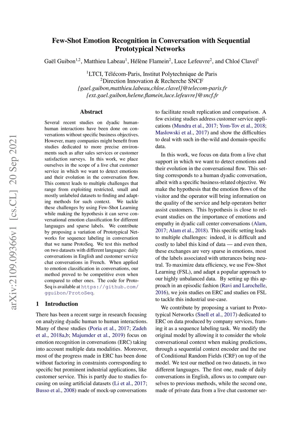 Several recent studies on dyadic human-human interactions have been done on conversations without specific business objectives. However, many companies might benefit from studies dedicated to more precise environments such as after sales services or customer satisfaction surveys. In this work, we place ourselves in the scope of a live chat customer service in which we want to detect emotions and their evolution in the conversation flow. This context leads to multiple challenges that range from exploiting restricted, small and mostly unlabeled datasets to finding and adapting methods for such context.We tackle these challenges by using Few-Shot Learning while making the hypothesis it can serve conversational emotion classification for different languages and sparse labels. We contribute by proposing a variation of Prototypical Networks for sequence labeling in conversation that we name ProtoSeq. We test this method on two datasets with different languages: daily conversations in English and customer service chat conversations in French. When applied to emotion classification in conversations, our method proved to be competitive even when compared to other ones.