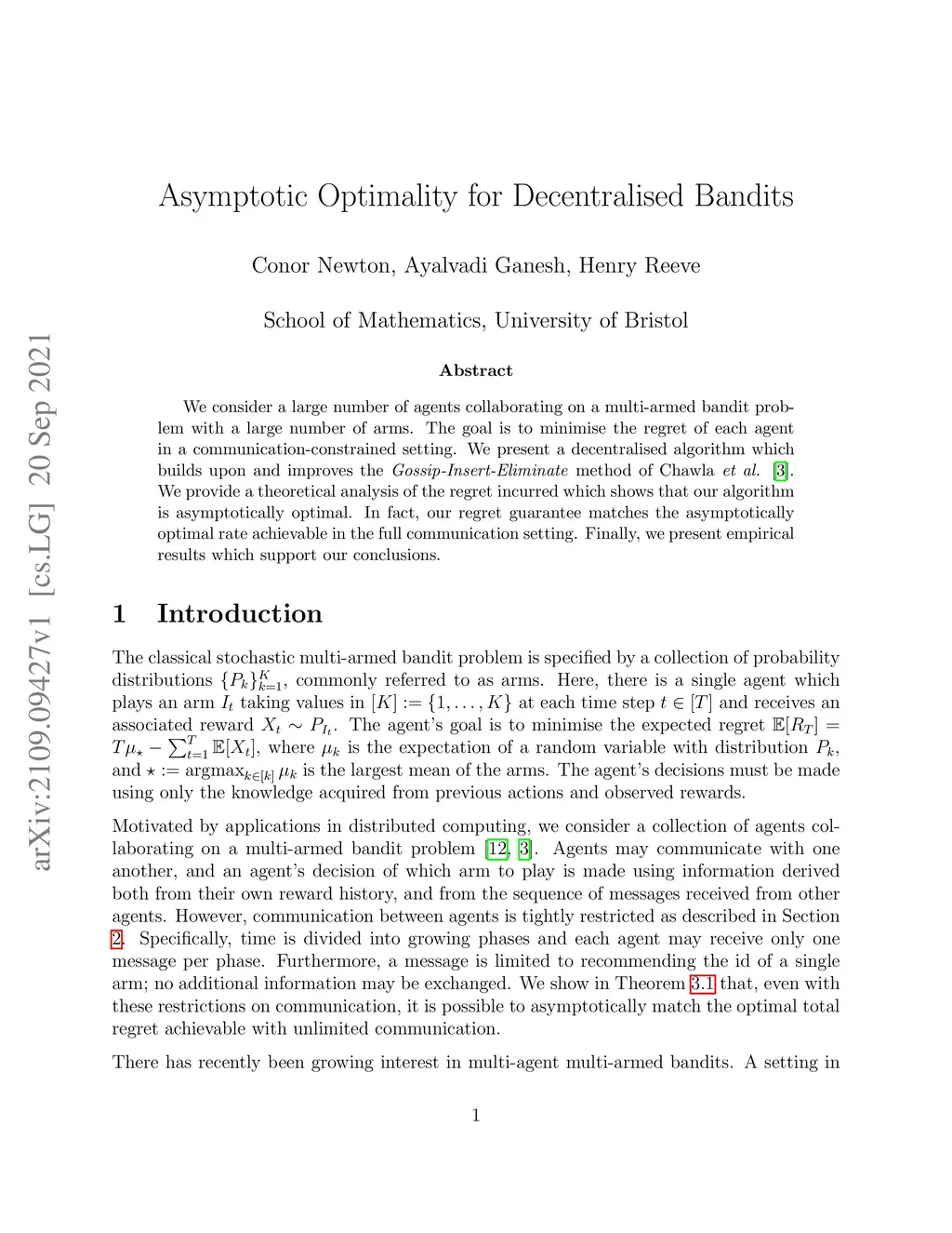 We consider a large number of agents collaborating on a multi-armed bandit problem with a large number of arms. The goal is to minimise the regret of each agent in a communication-constrained setting. We present a decentralised algorithm which builds upon and improves the Gossip-Insert-Eliminate method of Chawla et al. arxiv:2001.05452. We provide a theoretical analysis of the regret incurred which shows that our algorithm is asymptotically optimal. In fact, our regret guarantee matches the asymptotically optimal rate achievable in the full communication setting. Finally, we present empirical results which support our conclusions