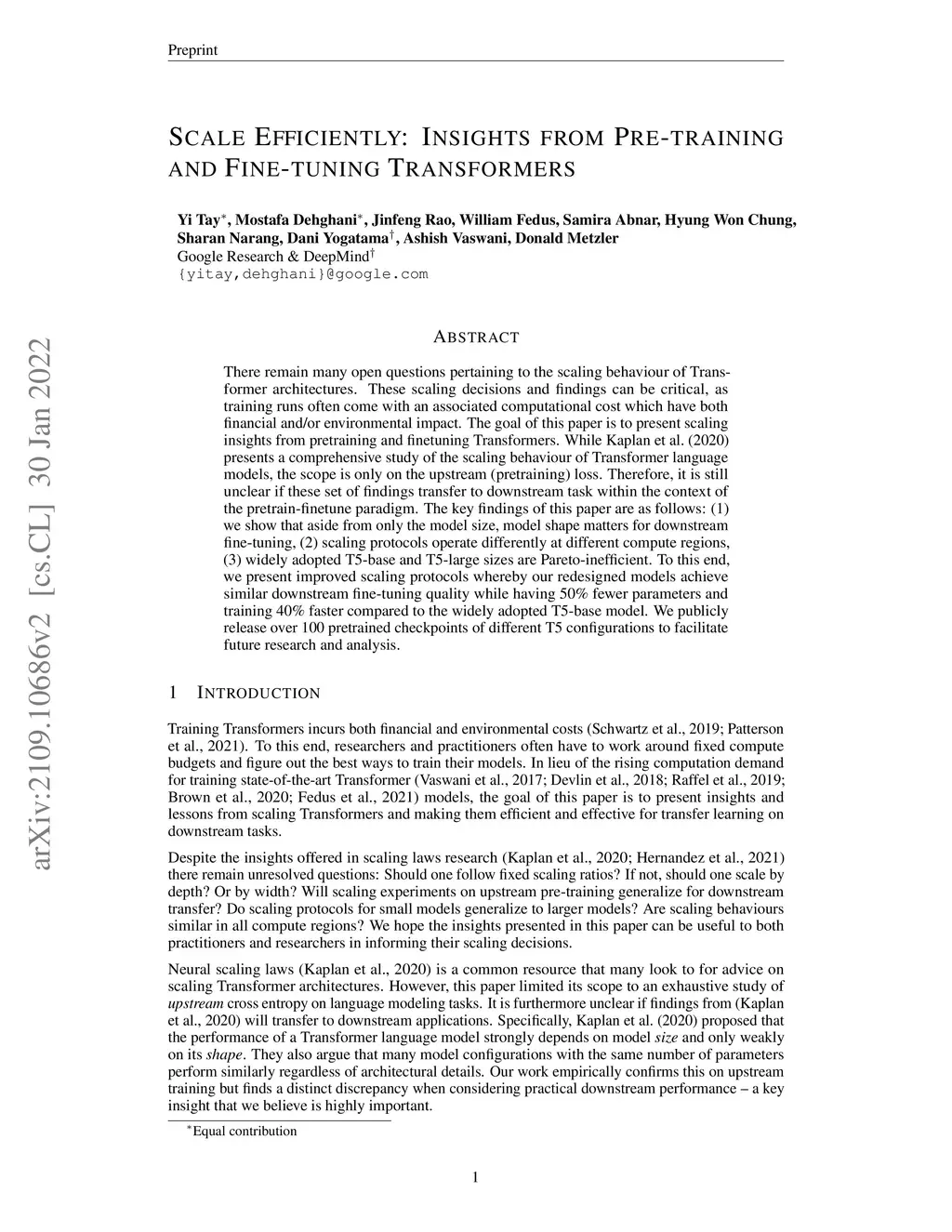 There remain many open questions pertaining to the scaling behaviour of Transformer architectures. These scaling decisions and findings can be critical, as training runs often come with an associated computational cost which have both financial and/or environmental impact. The goal of this paper is to present scaling insights from pretraining and finetuning Transformers. While Kaplan et al. presents a comprehensive study of the scaling behaviour of Transformer language models, the scope is only on the upstream (pretraining) loss. Therefore, it is still unclear if these set of findings transfer to downstream task within the context of the pretrain-finetune paradigm. The key findings of this paper are as follows: (1) we show that aside from only the model size, model shape matters for downstream fine-tuning, (2) scaling protocols operate differently at different compute regions, (3) widely adopted T5-base and T5-large sizes are Pareto-inefficient. To this end, we present improved scaling protocols whereby our redesigned models achieve similar downstream fine-tuning quality while having 50\% fewer parameters and training 40\% faster compared to the widely adopted T5-base model. We publicly release over 100 pretrained checkpoints of different T5 configurations to facilitate future research and analysis.