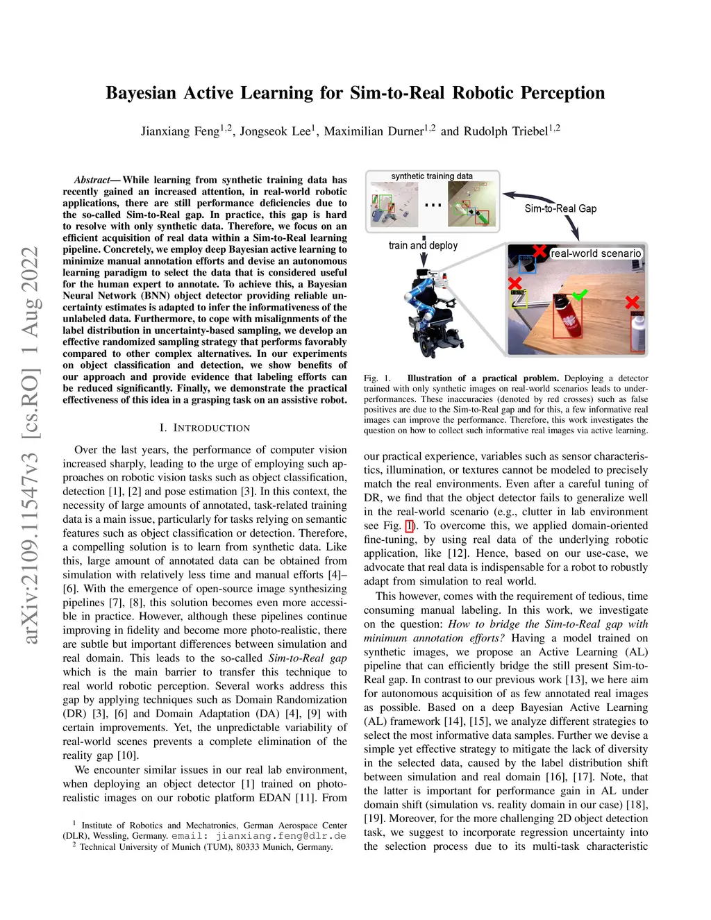 While learning from synthetic training data has recently gained an increased attention, in real-world robotic applications, there are still performance deficiencies due to the so-called Sim-to-Real gap. In practice, this gap is hard to resolve with only synthetic data. Therefore, we focus on an efficient acquisition of real data within a Sim-to-Real learning pipeline. Concretely, we employ deep Bayesian active learning to minimize manual annotation efforts and devise an autonomous learning paradigm to select the data that is considered useful for the human expert to annotate. To achieve this, a Bayesian Neural Network (BNN) object detector providing reliable uncertainty estimates is adapted to infer the informativeness of the unlabeled data. Furthermore, to cope with mis-alignments of the label distribution in uncertainty-based sampling, we develop an effective randomized sampling strategy that performs favorably compared to other complex alternatives. In our experiments on object classification and detection, we show benefits of our approach and provide evidence that labeling efforts can be reduced significantly. Finally, we demonstrate the practical effectiveness of this idea in a grasping task on an assistive robot.