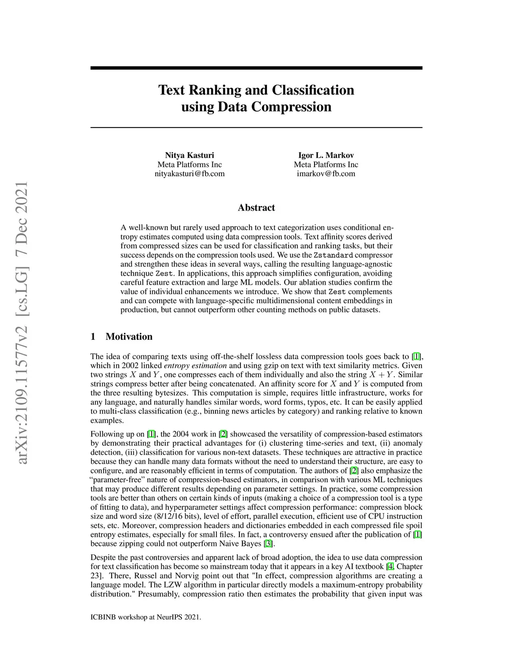 A well-known but rarely used approach to text categorization uses conditional entropy estimates computed using data compression tools. Text affinity scores derived from compressed sizes can be used for classification and ranking tasks, but their success depends on the compression tools used. We use the Zstandard compressor and strengthen these ideas in several ways, calling the resulting language-agnostic technique Zest. In applications, this approach simplifies configuration, avoiding careful feature extraction and large ML models. Our ablation studies confirm the value of individual enhancements we introduce. We show that Zest complements and can compete with language-specific multidimensional content embeddings in production, but cannot outperform other counting methods on public datasets.