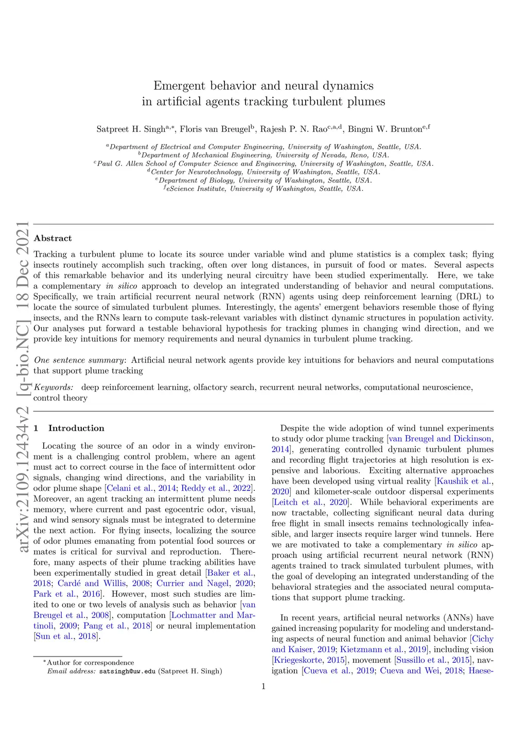 Tracking a turbulent plume to locate its source is a complex control problem because it requires multi-sensory integration and must be robust to intermittent odors, changing wind direction, and variable plume statistics. This task is routinely performed by flying insects, often over long distances, in pursuit of food or mates. Several aspects of this remarkable behavior have been studied in detail in many experimental studies. Here, we take a complementary in silico approach, using artificial agents trained with reinforcement learning to develop an integrated understanding of the behaviors and neural computations that support plume tracking. Specifically, we use deep reinforcement learning (DRL) to train recurrent neural network (RNN) agents to locate the source of simulated turbulent plumes. Interestingly, the agents' emergent behaviors resemble those of flying insects, and the RNNs learn to represent task-relevant variables, such as head direction and time since last odor encounter. Our analyses suggest an intriguing experimentally testable hypothesis for tracking plumes in changing wind direction -- that agents follow local plume shape rather than the current wind direction. While reflexive short-memory behaviors are sufficient for tracking plumes in constant wind, longer timescales of memory are essential for tracking plumes that switch direction. At the level of neural dynamics, the RNNs' population activity is low-dimensional and organized into distinct dynamical structures, with some correspondence to behavioral modules. Our in silico approach provides key intuitions for turbulent plume tracking strategies and motivates future targeted experimental and theoretical developments.