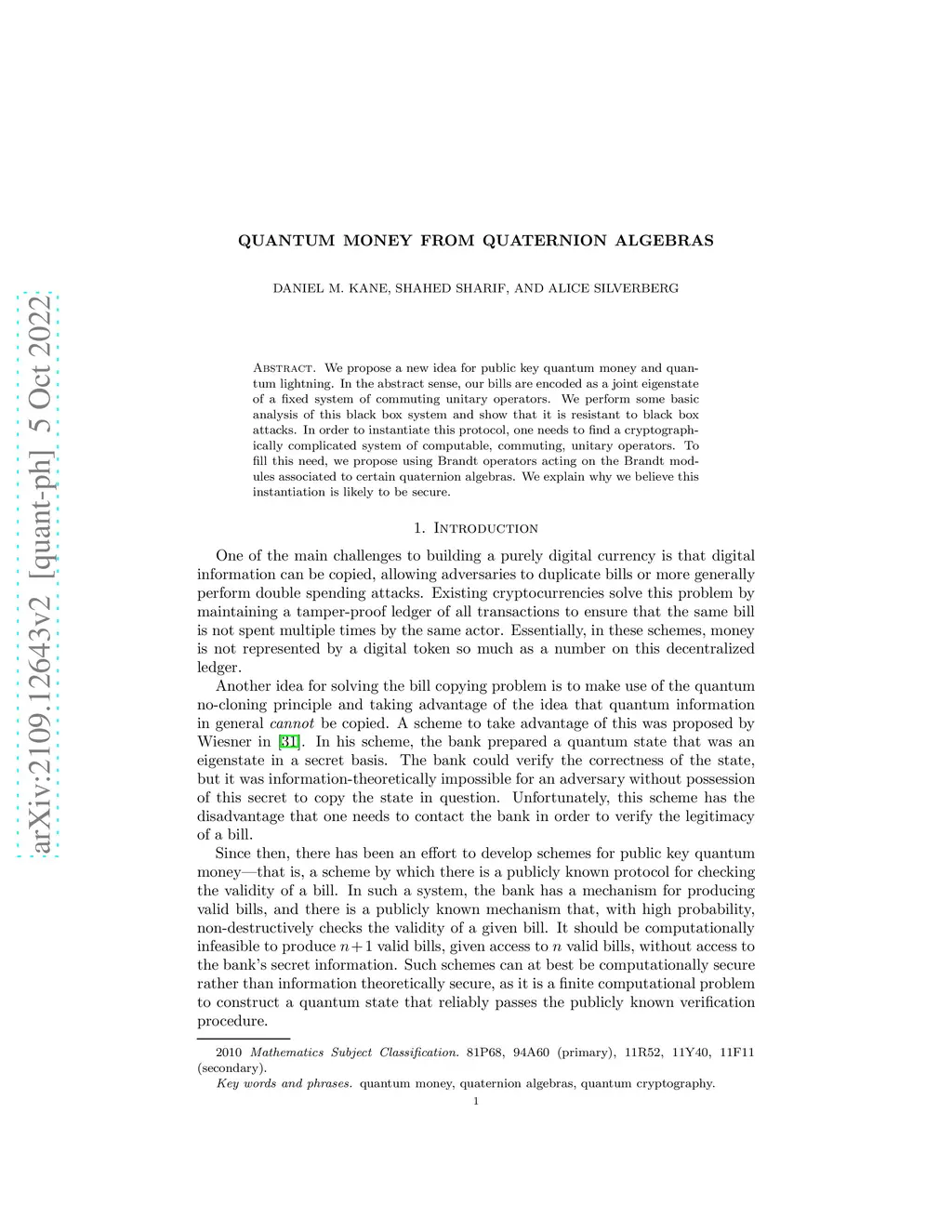 We propose a new idea for public key quantum money. In the abstract sense, our bills are encoded as a joint eigenstate of a fixed system of commuting unitary operators. We perform some basic analysis of this black box system and show that it is resistant to black box attacks. In order to instantiate this protocol, one needs to find a cryptographically complicated system of computable, commuting, unitary operators. To fill this need, we propose using Brandt operators acting on the Brandt modules associated to certain quaternion algebras. We explain why we believe this instantiation is likely to be secure.