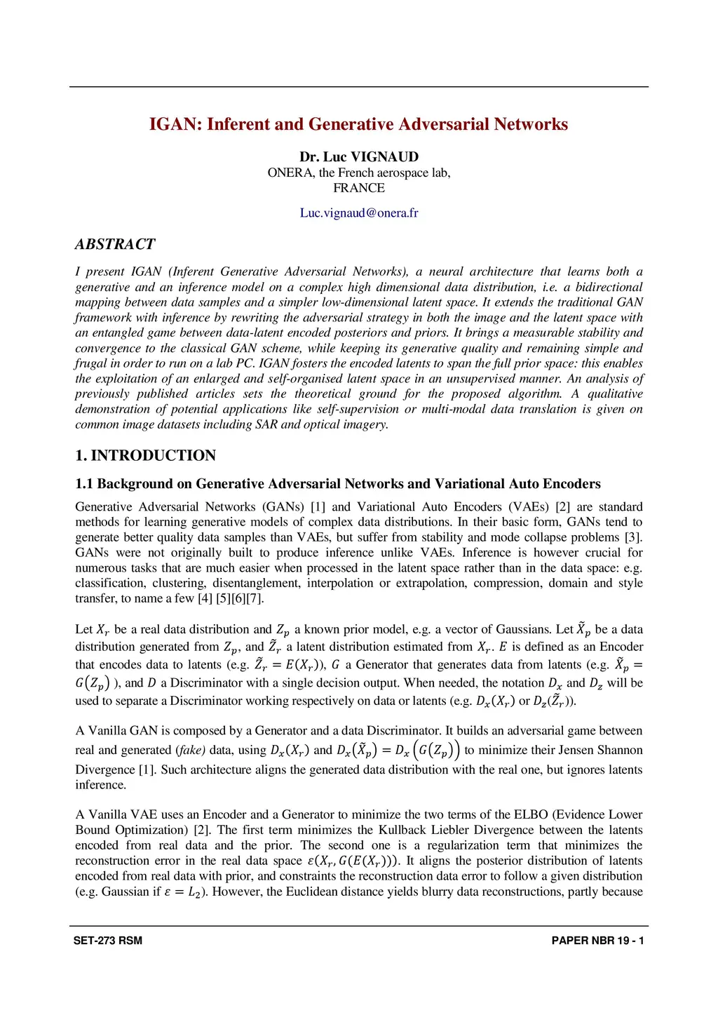 I present IGAN (Inferent Generative Adversarial Networks), a neural architecture that learns both a generative and an inference model on a complex high dimensional data distribution, i.e. a bidirectional mapping between data samples and a simpler low-dimensional latent space. It extends the traditional GAN framework with inference by rewriting the adversarial strategy in both the image and the latent space with an entangled game between data-latent encoded posteriors and priors. It brings a measurable stability and convergence to the classical GAN scheme, while keeping its generative quality and remaining simple and frugal in order to run on a lab PC. IGAN fosters the encoded latents to span the full prior space: this enables the exploitation of an enlarged and self-organised latent space in an unsupervised manner. An analysis of previously published articles sets the theoretical ground for the proposed algorithm. A qualitative demonstration of potential applications like self-supervision or multi-modal data translation is given on common image datasets including SAR and optical imagery.