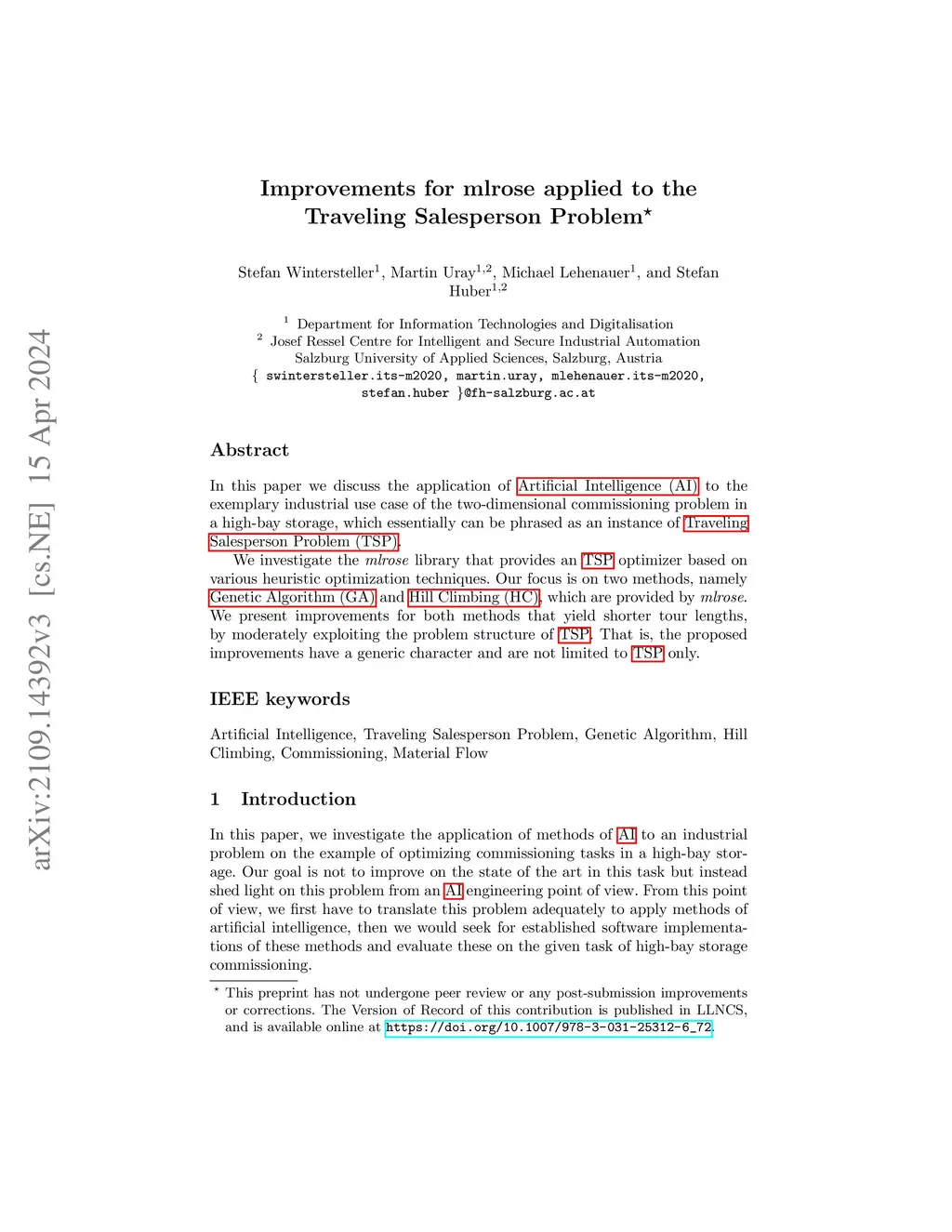 In this paper we discuss the application of Artificial Intelligence (AI) to the exemplary industrial use case of the two-dimensional commissioning problem in a high-bay storage, which essentially can be phrased as an instance of Traveling Salesperson Problem (TSP). We investigate the mlrose library that provides an TSP optimizer based on various heuristic optimization techniques. Our focus is on two methods, namely Genetic Algorithm (GA) and Hill Climbing (HC), which are provided by mlrose. We present improvements for both methods that yield shorter tour lengths, by moderately exploiting the problem structure of TSP. That is, the proposed improvements have a generic character and are not limited to TSP only.