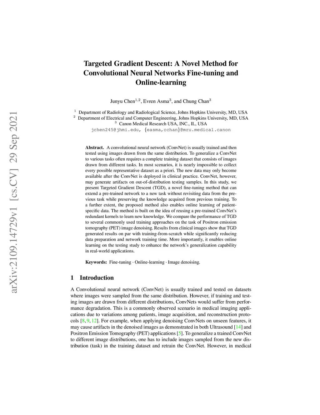 A convolutional neural network (ConvNet) is usually trained and then tested using images drawn from the same distribution. To generalize a ConvNet to various tasks often requires a complete training dataset that consists of images drawn from different tasks. In most scenarios, it is nearly impossible to collect every possible representative dataset as a priori. The new data may only become available after the ConvNet is deployed in clinical practice. ConvNet, however, may generate artifacts on out-of-distribution testing samples. In this study, we present Targeted Gradient Descent (TGD), a novel fine-tuning method that can extend a pre-trained network to a new task without revisiting data from the previous task while preserving the knowledge acquired from previous training. To a further extent, the proposed method also enables online learning of patient-specific data. The method is built on the idea of reusing a pre-trained ConvNet's redundant kernels to learn new knowledge. We compare the performance of TGD to several commonly used training approaches on the task of Positron emission tomography (PET) image denoising. Results from clinical images show that TGD generated results on par with training-from-scratch while significantly reducing data preparation and network training time. More importantly, it enables online learning on the testing study to enhance the network's generalization capability in real-world applications.
