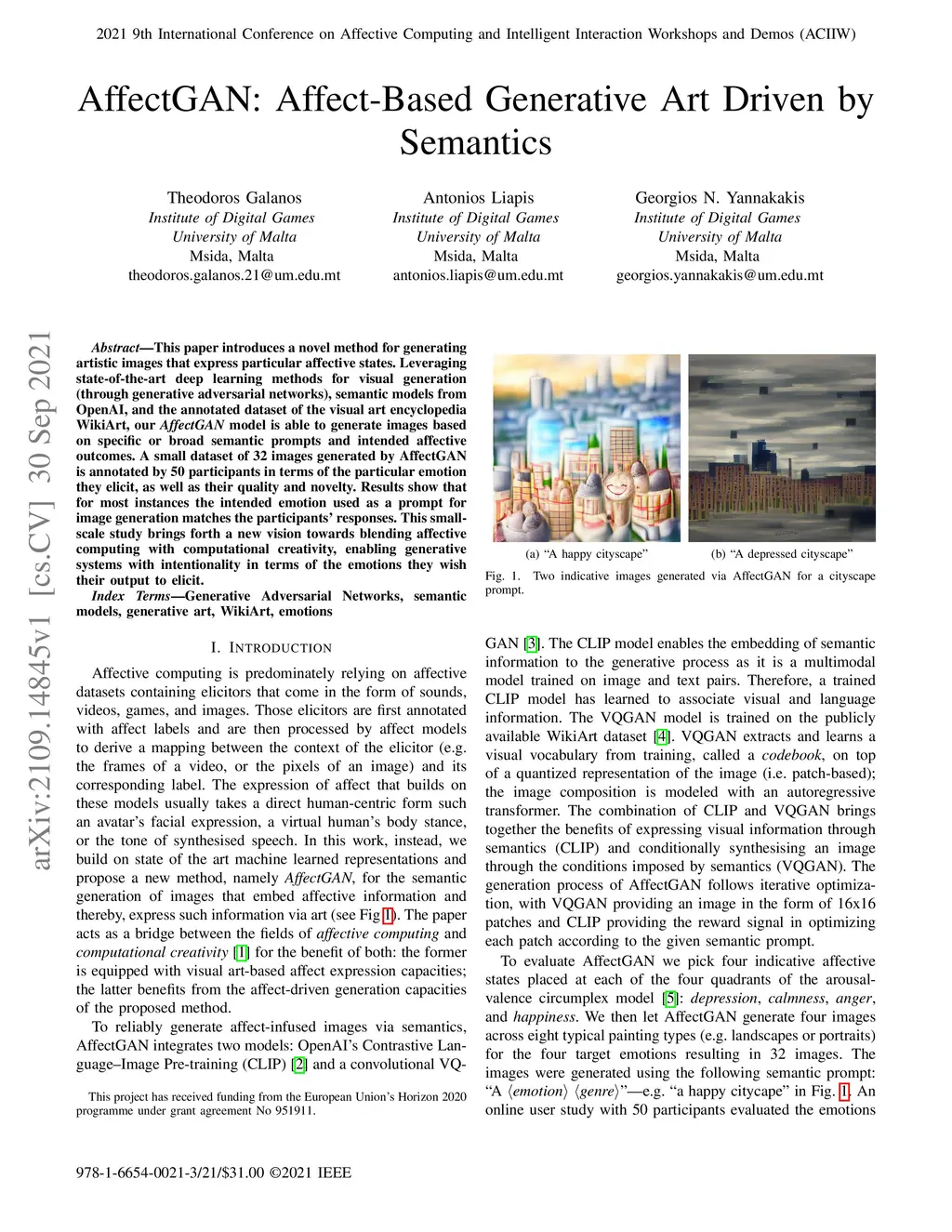 This paper introduces a novel method for generating artistic images that express particular affective states. Leveraging state-of-the-art deep learning methods for visual generation (through generative adversarial networks), semantic models from OpenAI, and the annotated dataset of the visual art encyclopedia WikiArt, our AffectGAN model is able to generate images based on specific or broad semantic prompts and intended affective outcomes. A small dataset of 32 images generated by AffectGAN is annotated by 50 participants in terms of the particular emotion they elicit, as well as their quality and novelty. Results show that for most instances the intended emotion used as a prompt for image generation matches the participants' responses. This small-scale study brings forth a new vision towards blending affective computing with computational creativity, enabling generative systems with intentionality in terms of the emotions they wish their output to elicit.