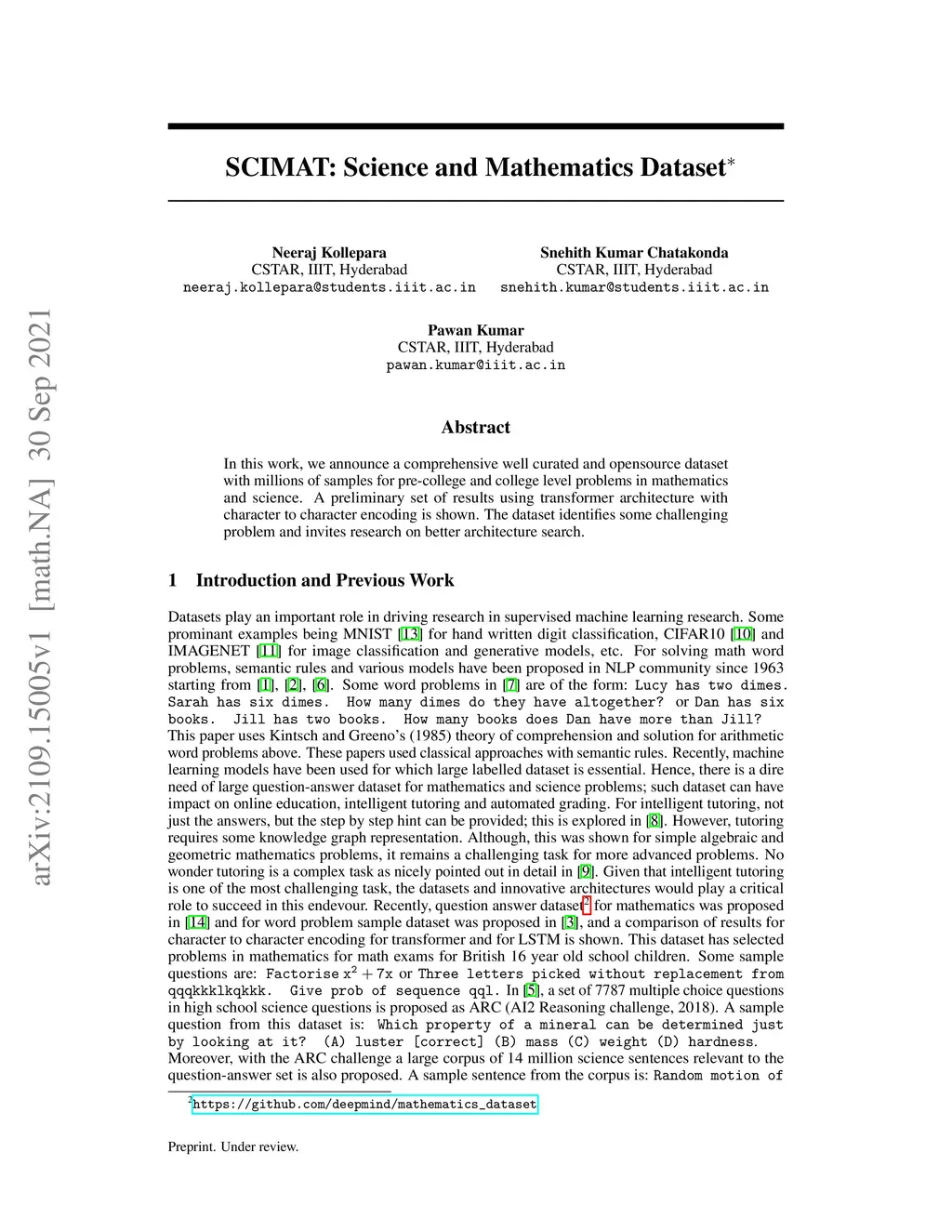 In this work, we announce a comprehensive well curated and opensource dataset with millions of samples for pre-college and college level problems in mathematicsand science. A preliminary set of results using transformer architecture with character to character encoding is shown. The dataset identifies some challenging problem and invites research on better architecture search