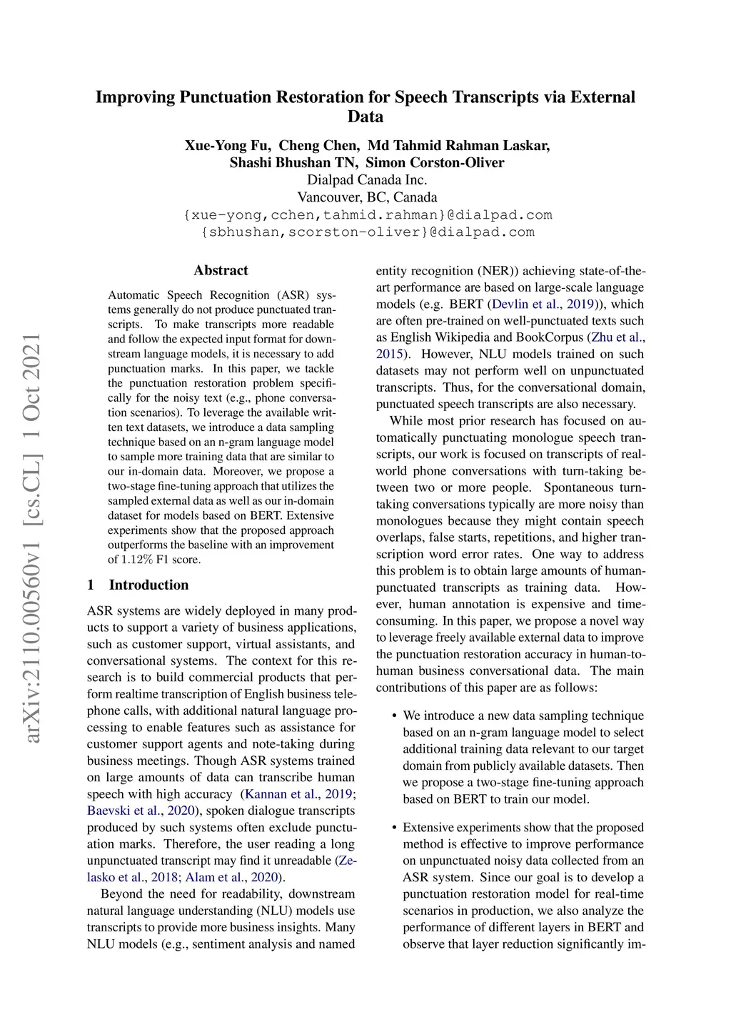 Automatic Speech Recognition (ASR) systems generally do not produce punctuated transcripts. To make transcripts more readable and follow the expected input format for downstream language models, it is necessary to add punctuation marks. In this paper, we tackle the punctuation restoration problem specifically for the noisy text (e.g., phone conversation scenarios). To leverage the available written text datasets, we introduce a data sampling technique based on an n-gram language model to sample more training data that are similar to our in-domain data. Moreover, we propose a two-stage fine-tuning approach that utilizes the sampled external data as well as our in-domain dataset for models based on BERT. Extensive experiments show that the proposed approach outperforms the baseline with an improvement of 1:12% F1 score.