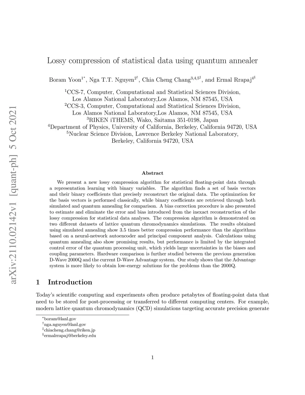 We present a new lossy compression algorithm for statistical floating-point data through a representation learning with binary variables. The algorithm finds a set of basis vectors and their binary coefficients that precisely reconstruct the original data. The optimization for the basis vectors is performed classically, while binary coefficients are retrieved through both simulated and quantum annealing for comparison. A bias correction procedure is also presented to estimate and eliminate the error and bias introduced from the inexact reconstruction of the lossy compression for statistical data analyses. The compression algorithm is demonstrated on two different datasets of lattice quantum chromodynamics simulations. The results obtained using simulated annealing show 3.5 times better compression performance than the algorithms based on a neural-network autoencoder and principal component analysis. Calculations using quantum annealing also show promising results, but performance is limited by the integrated control error of the quantum processing unit, which yields large uncertainties in the biases and coupling parameters. Hardware comparison is further studied between the previous generation D-Wave 2000Q and the current D-Wave Advantage system. Our study shows that the Advantage system is more likely to obtain low-energy solutions for the problems than the 2000Q.