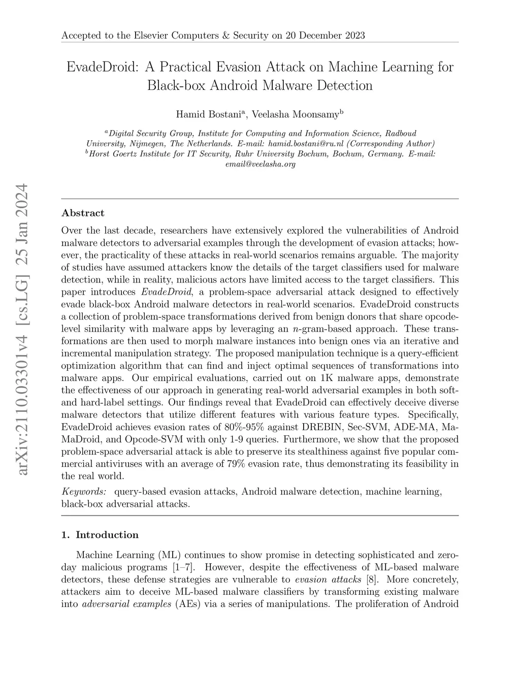 EvadeDroid: A Practical Evasion Attack on Machine Learning for Black-box