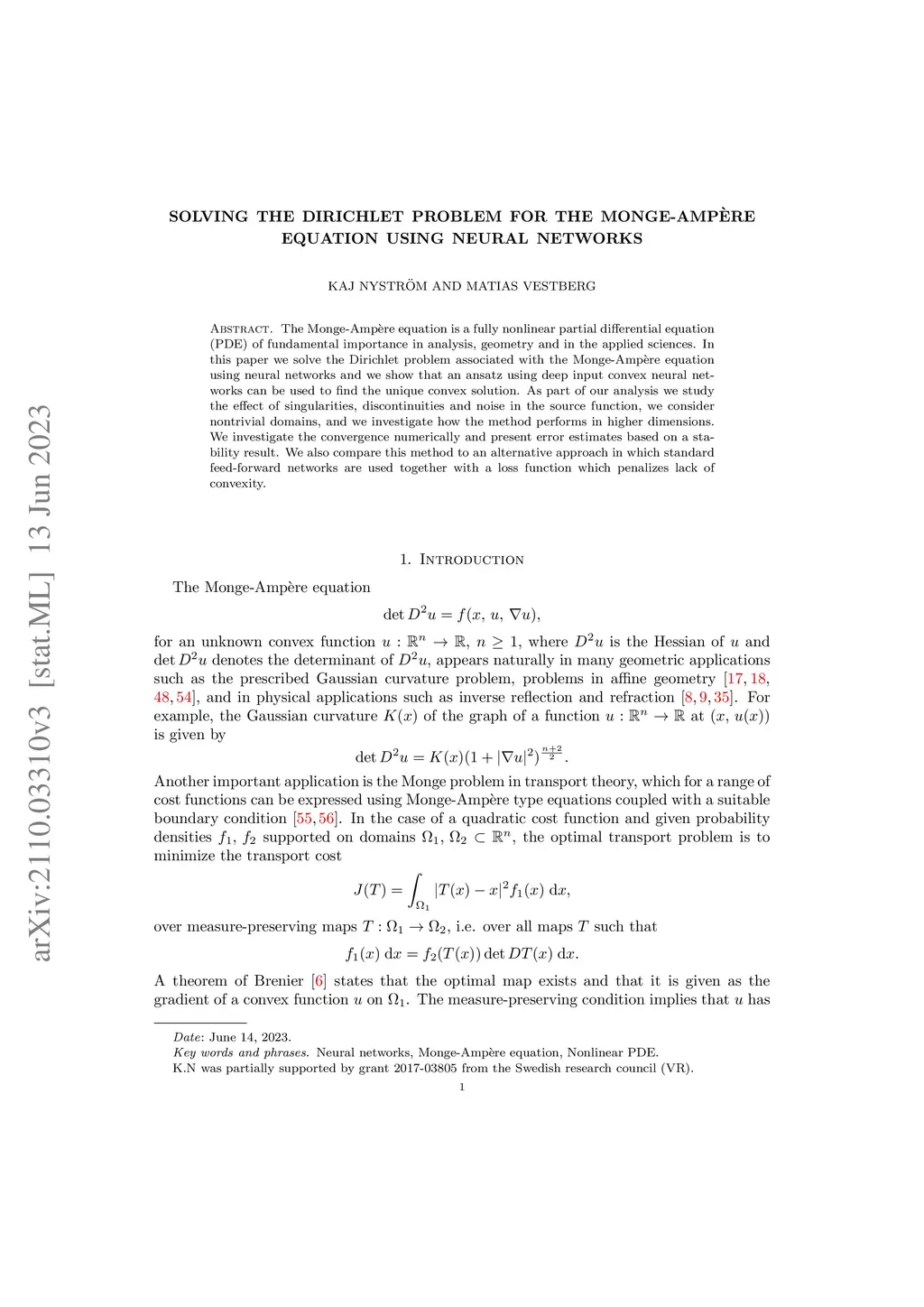 The Monge-Amp\`ere equation is a fully nonlinear partial differential equation (PDE) of fundamental importance in analysis, geometry and in the applied sciences. In this paper we solve the Dirichlet problem associated with the Monge-Amp\`ere equation using neural networks and we show that an ansatz using deep input convex neural networks can be used to find the unique convex solution. As part of our analysis we study the effect of singularities, discontinuities and noise in the source function, we consider nontrivial domains, and we investigate how the method performs in higher dimensions. We investigate the convergence numerically and present error estimates based on a stability result. We also compare this method to an alternative approach in which standard feed-forward networks are used together with a loss function which penalizes lack of convexity.