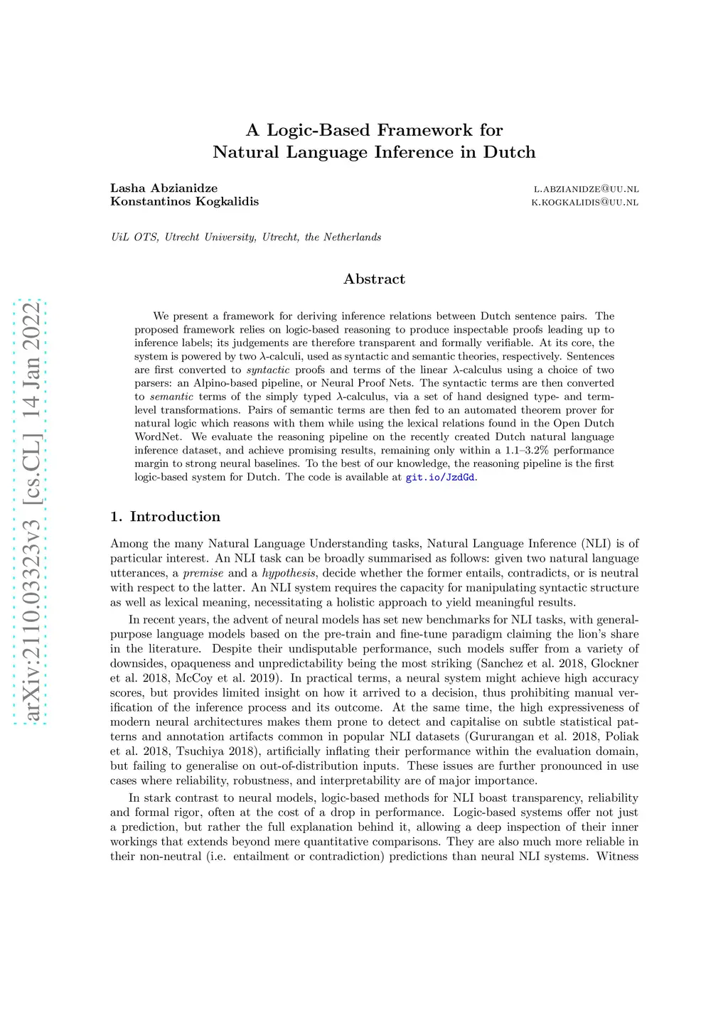 We present a framework for deriving inference relations between Dutch sentence pairs. The proposed framework relies on logic-based reasoning to produce inspectable proofs leading up to inference labels; its judgements are therefore transparent and formally verifiable. At its core, the system is powered by two -calculi, used as syntactic and semantic theories, respectively. Sentences are first converted to syntactic proofs and terms of the linear -calculus using a choice of two parsers: an Alpino-based pipeline, and Neural Proof Nets. The syntactic terms are then converted to semantic terms of the simply typed -calculus, via a set of hand designed type- and term-level transformations. Pairs of semantic terms are then fed to an automated theorem prover for natural logic which reasons with them while using the lexical relations found in the Open Dutch WordNet. We evaluate the reasoning pipeline on the recently created Dutch natural language inference dataset, and achieve promising results, remaining only within a performance margin to strong neural baselines. To the best of our knowledge, the reasoning pipeline is the first logic-based system for Dutch.