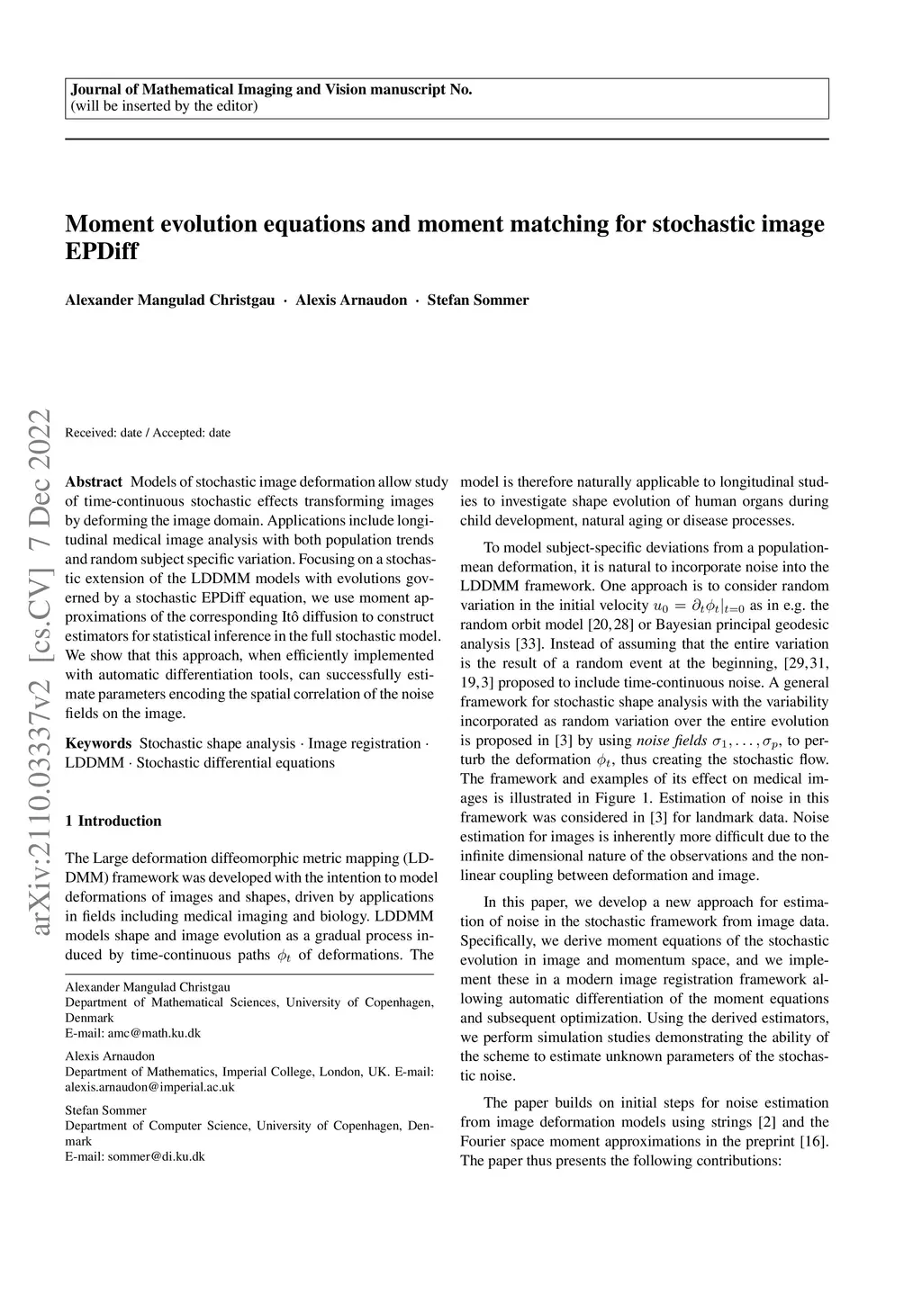 Models of stochastic image deformation allow study of time-continuous stochastic effects transforming images by deforming the image domain. Applications include longitudinal medical image analysis with both population trends and random subject specific variation. Focusing on a stochastic extension of the LDDMM models with evolutions governed by a stochastic EPDiff equation, we use moment approximations of the corresponding It\^o diffusion to construct estimators for statistical inference in the full stochastic model. We show that this approach, when efficiently implemented with automatic differentiation tools, can successfully estimate parameters encoding the spatial correlation of the noise fields on the image.