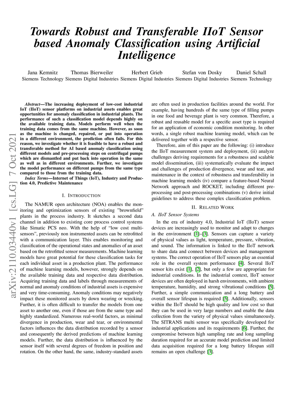 The increasing deployment of low-cost industrial IoT (IIoT) sensor platforms on industrial assets enables great opportunities for anomaly classification in industrial plants. The performance of such a classification model depends highly on the available training data. Models perform well when the training data comes from the same machine. However, as soon as the machine is changed, repaired, or put into operation in a different environment, the prediction often fails. For this reason, we investigate whether it is feasible to have a robust and transferable method for AI based anomaly classification using different models and pre-processing steps on centrifugal pumps which are dismantled and put back into operation in the same as well as in different environments. Further, we investigate the model performance on different pumps from the same type compared to those from the training data.