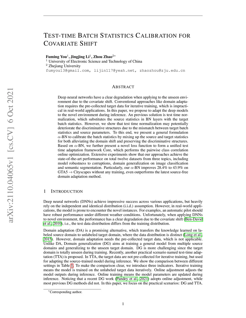 Deep neural networks have a clear degradation when applying to the unseen environment due to the covariate shift. Conventional approaches like domain adaptation requires the pre-collected target data for iterative training, which is impractical in real-world applications. In this paper, we propose to adapt the deep models to the novel environment during inference. An previous solution is test time normalization, which substitutes the source statistics in BN layers with the target batch statistics. However, we show that test time normalization may potentially deteriorate the discriminative structures due to the mismatch between target batch statistics and source parameters. To this end, we present a general formulation -BN to calibrate the batch statistics by mixing up the source and target statistics for both alleviating the domain shift and preserving the discriminative structures. Based on -BN, we further present a novel loss function to form a unified test time adaptation framework Core, which performs the pairwise class correlation online optimization. Extensive experiments show that our approaches achieve the state-of-the-art performance on total twelve datasets from three topics, including model robustness to corruptions, domain generalization on image classification and semantic segmentation. Particularly, our -BN improves 28.4\% to 43.9\% on GTA5 Cityscapes without any training, even outperforms the latest source-free domain adaptation method.