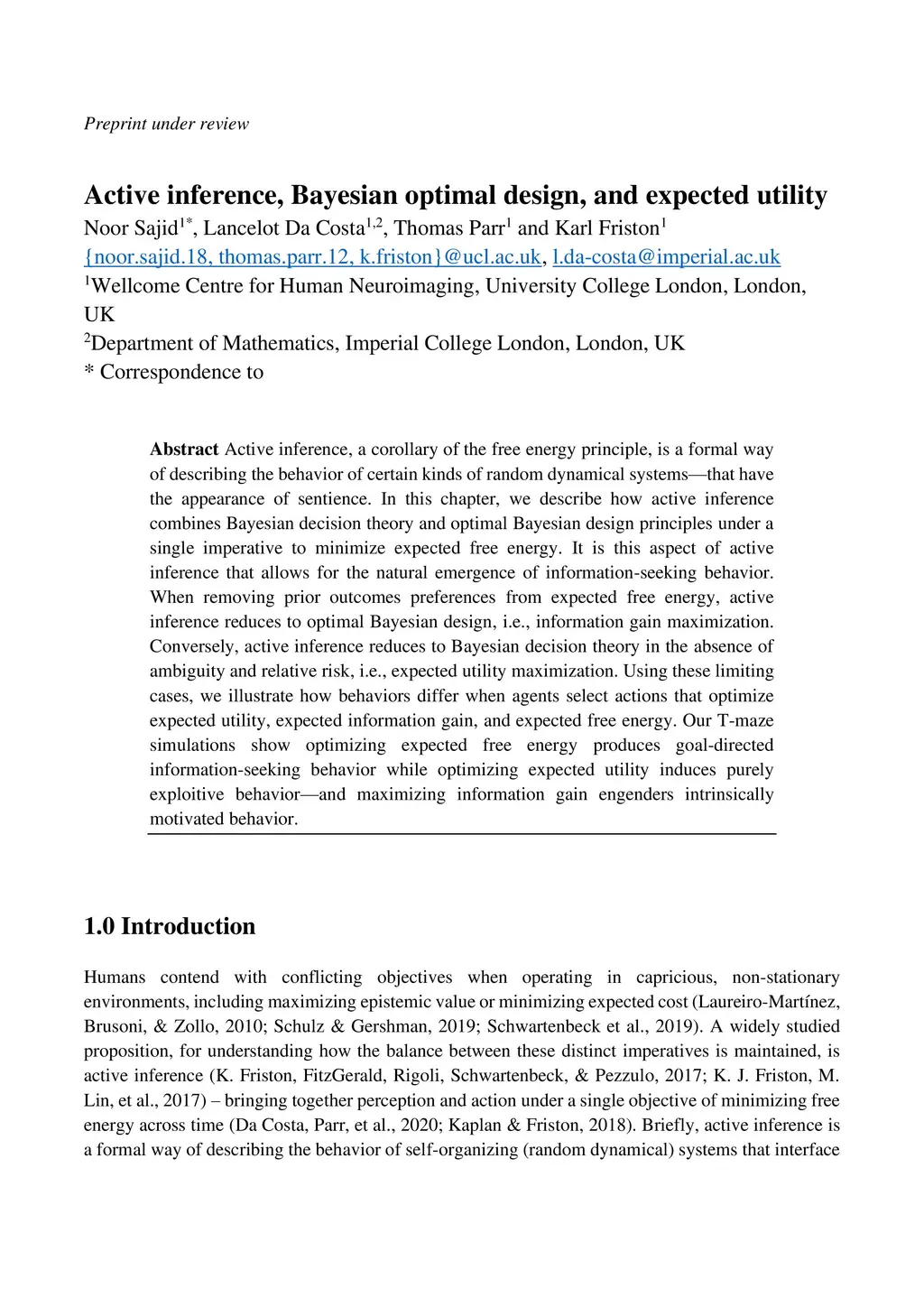 Active inference, a corollary of the free energy principle, is a formal way of describing the behavior of certain kinds of random dynamical systems that have the appearance of sentience. In this chapter, we describe how active inference combines Bayesian decision theory and optimal Bayesian design principles under a single imperative to minimize expected free energy. It is this aspect of active inference that allows for the natural emergence of information-seeking behavior. When removing prior outcomes preferences from expected free energy, active inference reduces to optimal Bayesian design, i.e., information gain maximization. Conversely, active inference reduces to Bayesian decision theory in the absence of ambiguity and relative risk, i.e., expected utility maximization. Using these limiting cases, we illustrate how behaviors differ when agents select actions that optimize expected utility, expected information gain, and expected free energy. Our T-maze simulations show optimizing expected free energy produces goal-directed information-seeking behavior while optimizing expected utility induces purely exploitive behavior and maximizing information gain engenders intrinsically motivated behavior.