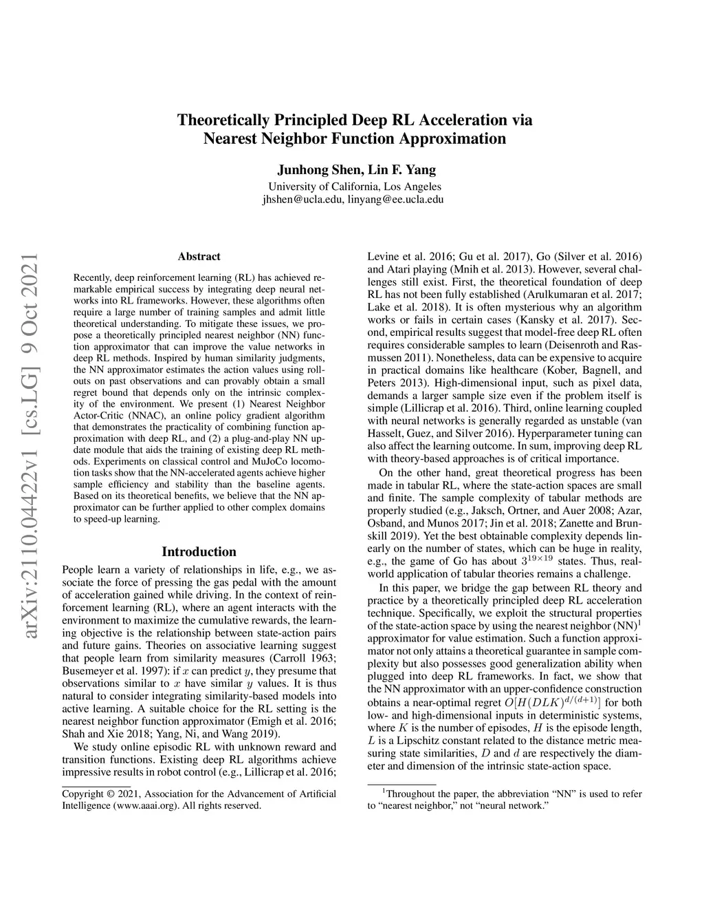 Recently, deep reinforcement learning (RL) has achieved remarkable empirical success by integrating deep neural networks into RL frameworks. However, these algorithms often require a large number of training samples and admit little theoretical understanding. To mitigate these issues, we propose a theoretically principled nearest neighbor (NN) function approximator that can improve the value networks in deep RL methods. Inspired by human similarity judgments, the NN approximator estimates the action values using rollouts on past observations and can provably obtain a small regret bound that depends only on the intrinsic complexity of the environment. We present (1) Nearest Neighbor Actor-Critic (NNAC), an online policy gradient algorithm that demonstrates the practicality of combining function approximation with deep RL, and (2) a plug-and-play NN update module that aids the training of existing deep RL methods. Experiments on classical control and MuJoCo locomotion tasks show that the NN-accelerated agents achieve higher sample efficiency and stability than the baseline agents. Based on its theoretical benefits, we believe that the NN approximator can be further applied to other complex domains to speed-up learning.