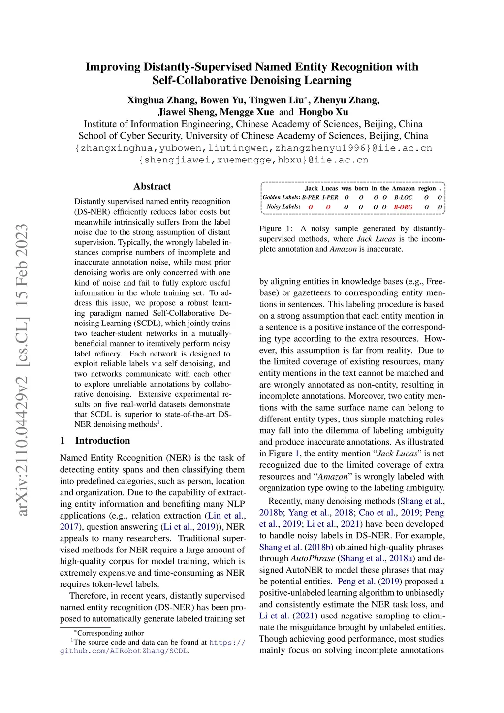 Distantly supervised named entity recognition (DS-NER) efficiently reduces labor costs but meanwhile intrinsically suffers from the label noise due to the strong assumption of distant supervision. Typically, the wrongly labeled instances comprise numbers of incomplete and inaccurate annotation noise, while most prior denoising works are only concerned with one kind of noise and fail to fully explore useful information in the whole training set. To address this issue, we propose a robust learning paradigm named Self-Collaborative Denoising Learning (SCDL), which jointly trains two teacher-student networks in a mutually-beneficial manner to iteratively perform noisy label refinery. Each network is designed to exploit reliable labels via self denoising, and two networks communicate with each other to explore unreliable annotations by collaborative denoising. Extensive experimental results on five real-world datasets demonstrate that SCDL is superior to state-of-the-art DS-NER denoising methods.