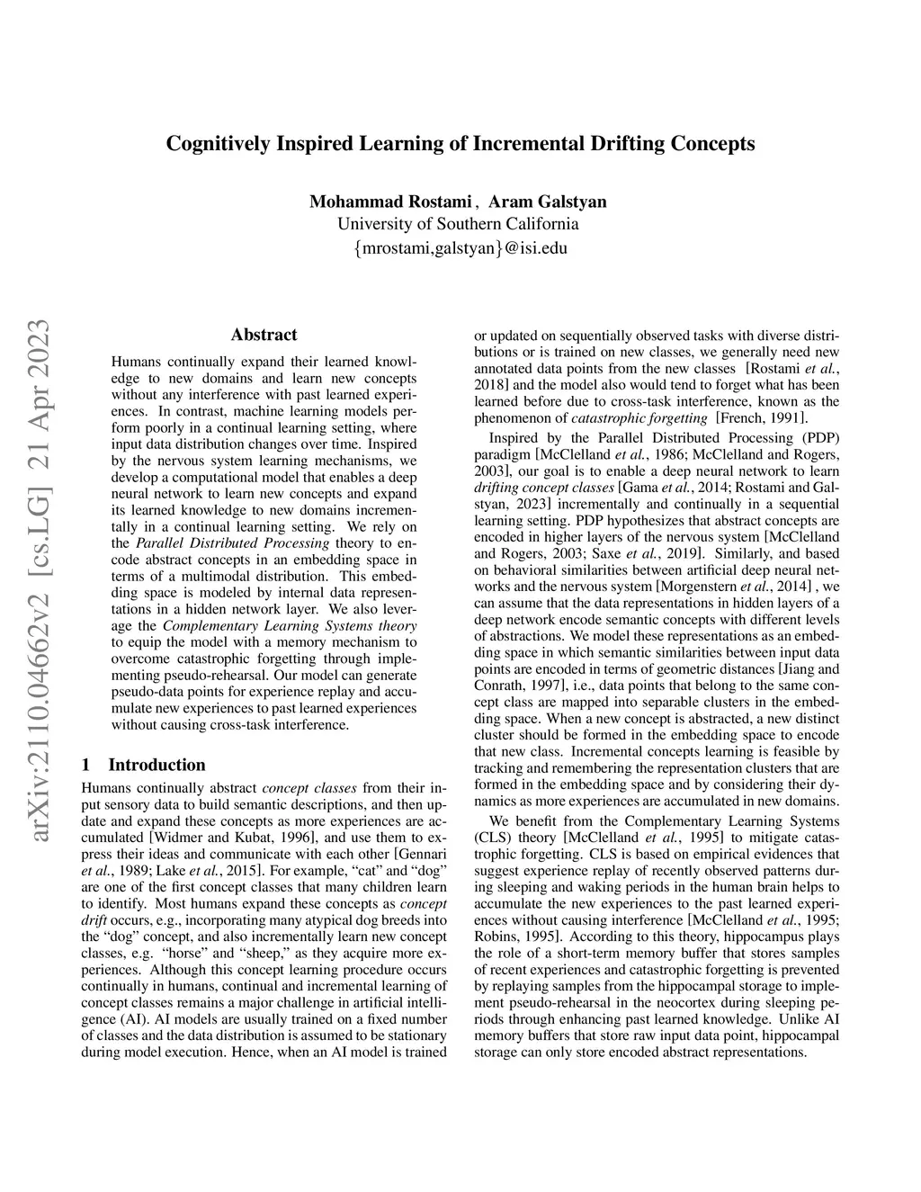 Humans continually expand their learned knowledge to new domains and learn new concepts without any interference with past learned experiences. In contrast, machine learning models perform poorly in a continual learning setting, where input data distribution changes over time. Inspired by the nervous system learning mechanisms, we develop a computational model that enables a deep neural network to learn new concepts and expand its learned knowledge to new domains incrementally in a continual learning setting. We rely on the Parallel Distributed Processing theory to encode abstract concepts in an embedding space in terms of a multimodal distribution. This embedding space is modeled by internal data representations in a hidden network layer. We also leverage the Complementary Learning Systems theory to equip the model with a memory mechanism to overcome catastrophic forgetting through implementing pseudo-rehearsal. Our model can generate pseudo-data points for experience replay and accumulate new experiences to past learned experiences without causing cross-task interference.