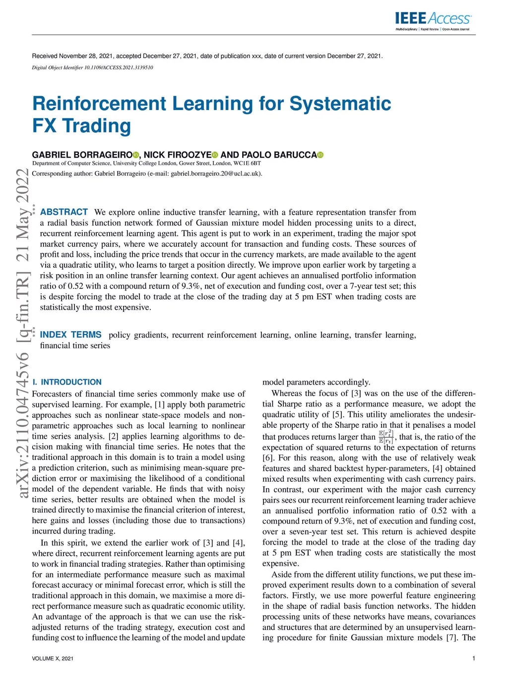 We explore online inductive transfer learning, with a feature representation transfer from a radial basis function network formed of Gaussian mixture model hidden processing units to a direct, recurrent reinforcement learning agent. This agent is put to work in an experiment, trading the major spot market currency pairs, where we accurately account for transaction and funding costs. These sources of profit and loss, including the price trends that occur in the currency markets, are made available to the agent via a quadratic utility, who learns to target a position directly. We improve upon earlier work by targeting a risk position in an online transfer learning context. Our agent achieves an annualised portfolio information ratio of 0.52 with a compound return of 9.3\%, net of execution and funding cost, over a 7-year test set; this is despite forcing the model to trade at the close of the trading day at 5 pm EST when trading costs are statistically the most expensive.