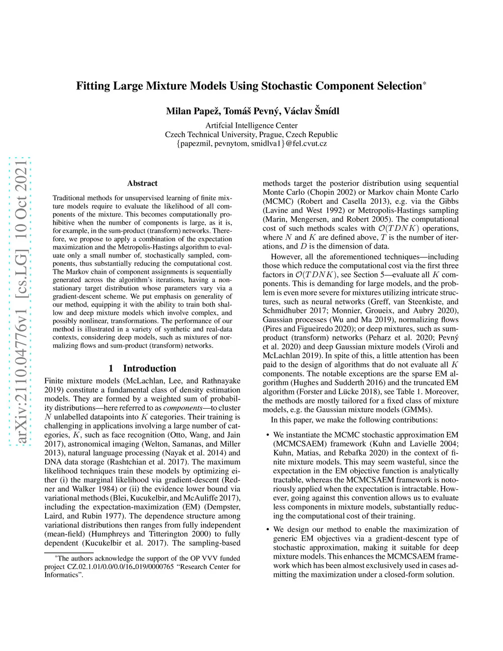 Traditional methods for unsupervised learning of finite mixture models require to evaluate the likelihood of all components of the mixture. This becomes computationally prohibitive when the number of components is large, as it is, for example, in the sum-product (transform) networks. Therefore, we propose to apply a combination of the expectation maximization and the Metropolis-Hastings algorithm to evaluate only a small number of, stochastically sampled, components, thus substantially reducing the computational cost. The Markov chain of component assignments is sequentially generated across the algorithm's iterations, having a non-stationary target distribution whose parameters vary via a gradient-descent scheme. We put emphasis on generality of our method, equipping it with the ability to train both shallow and deep mixture models which involve complex, and possibly nonlinear, transformations. The performance of our method is illustrated in a variety of synthetic and real-data contexts, considering deep models, such as mixtures of normalizing flows and sum-product (transform) networks.
