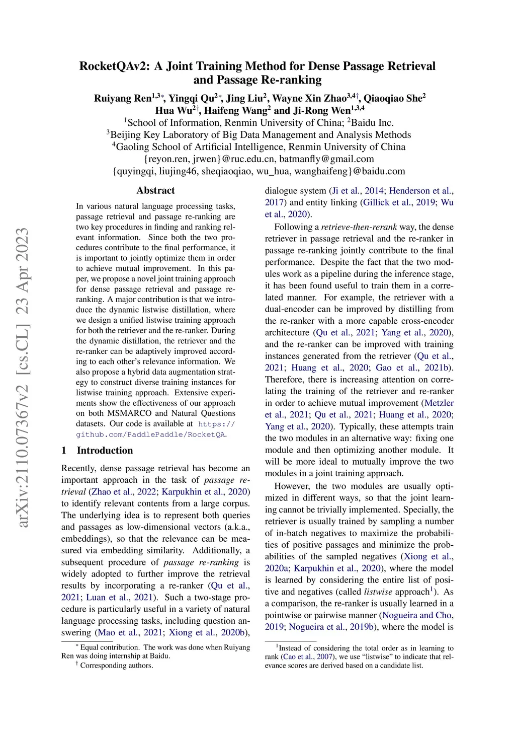 RocketQAv2: A Joint Training Method for Dense Passage Retrieval and