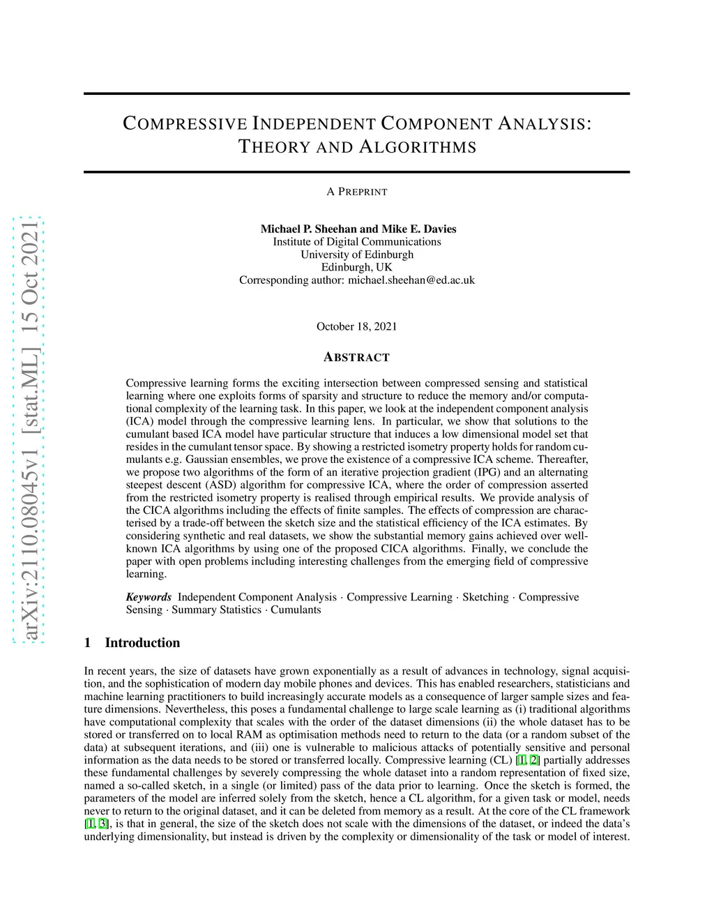 Compressive learning forms the exciting intersection between compressed sensing and statistical learning where one exploits forms of sparsity and structure to reduce the memory and/or computational complexity of the learning task. In this paper, we look at the independent component analysis (ICA) model through the compressive learning lens. In particular, we show that solutions to the cumulant based ICA model have particular structure that induces a low dimensional model set that resides in the cumulant tensor space. By showing a restricted isometry property holds for random cumulants e.g. Gaussian ensembles, we prove the existence of a compressive ICA scheme. Thereafter, we propose two algorithms of the form of an iterative projection gradient (IPG) and an alternating steepest descent (ASD) algorithm for compressive ICA, where the order of compression asserted from the restricted isometry property is realised through empirical results. We provide analysis of the CICA algorithms including the effects of finite samples. The effects of compression are characterised by a trade-off between the sketch size and the statistical efficiency of the ICA estimates. By considering synthetic and real datasets, we show the substantial memory gains achieved over well-known ICA algorithms by using one of the proposed CICA algorithms. Finally, we conclude the paper with open problems including interesting challenges from the emerging field of compressive learning.