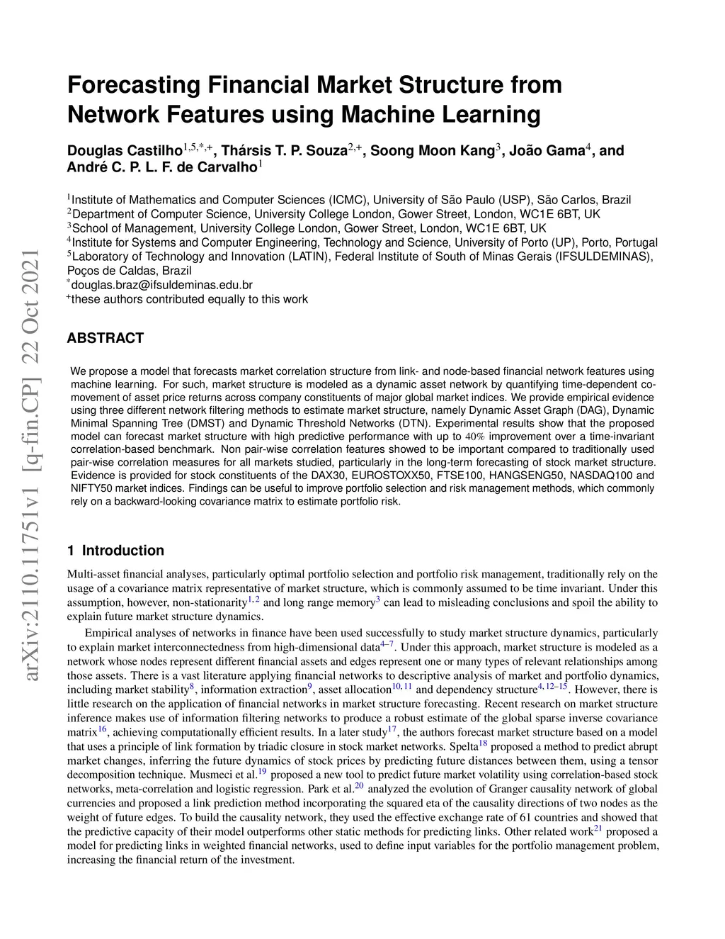 We propose a model that forecasts market correlation structure from link- and node-based financial network features using machine learning. For such, market structure is modeled as a dynamic asset network by quantifying time-dependent co-movement of asset price returns across company constituents of major global market indices. We provide empirical evidence using three different network filtering methods to estimate market structure, namely Dynamic Asset Graph (DAG), Dynamic Minimal Spanning Tree (DMST) and Dynamic Threshold Networks (DTN). Experimental results show that the proposed model can forecast market structure with high predictive performance with up to improvement over a time-invariant correlation-based benchmark. Non-pair-wise correlation features showed to be important compared to traditionally used pair-wise correlation measures for all markets studied, particularly in the long-term forecasting of stock market structure. Evidence is provided for stock constituents of the DAX30, EUROSTOXX50, FTSE100, HANGSENG50, NASDAQ100 and NIFTY50 market indices. Findings can be useful to improve portfolio selection and risk management methods, which commonly rely on a backward-looking covariance matrix to estimate portfolio risk.