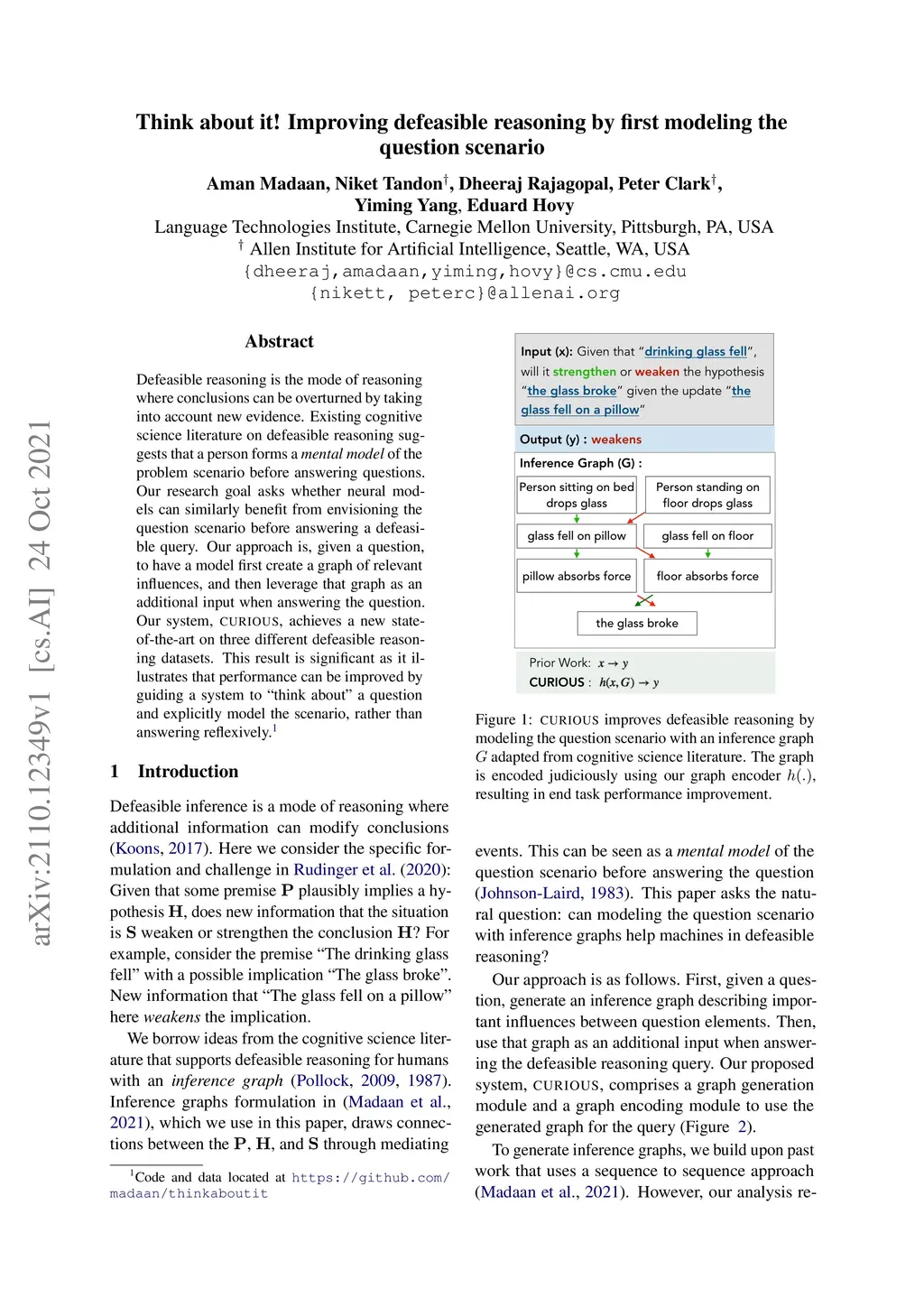 Defeasible reasoning is the mode of reasoning where conclusions can be overturned by taking into account new evidence. Existing cognitive science literature on defeasible reasoning suggests that a person forms a mental model of the problem scenario before answering questions. Our research goal asks whether neural models can similarly benefit from envisioning the question scenario before answering a defeasible query. Our approach is, given a question, to have a model first create a graph of relevant influences, and then leverage that graph as an additional input when answering the question. Our system, CURIOUS, achieves a new state-of-the-art on three different defeasible reasoning datasets. This result is significant as it illustrates that performance can be improved by guiding a system to "think about" a question and explicitly model the scenario, rather than answering reflexively. Code, data, and pre-trained models are located at https://github.com/madaan/thinkaboutit.