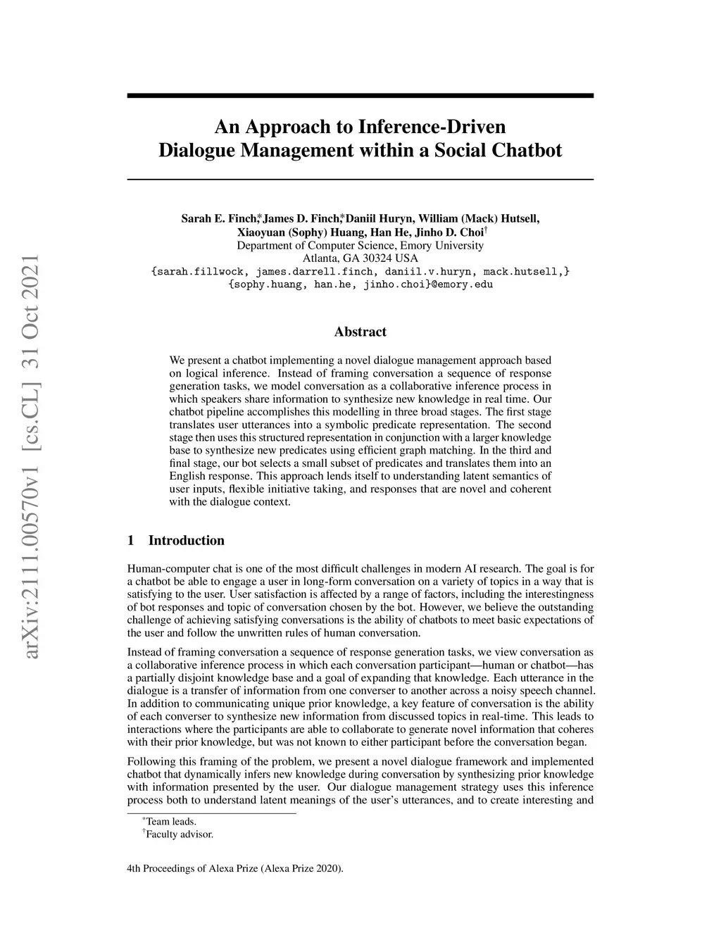 We present a chatbot implementing a novel dialogue management approach based on logical inference. Instead of framing conversation a sequence of response generation tasks, we model conversation as a collaborative inference process in which speakers share information to synthesize new knowledge in real time. Our chatbot pipeline accomplishes this modelling in three broad stages. The first stage translates user utterances into a symbolic predicate representation. The second stage then uses this structured representation in conjunction with a larger knowledge base to synthesize new predicates using efficient graph matching. In the third and final stage, our bot selects a small subset of predicates and translates them into an English response. This approach lends itself to understanding latent semantics of user inputs, flexible initiative taking, and responses that are novel and coherent with the dialogue context.