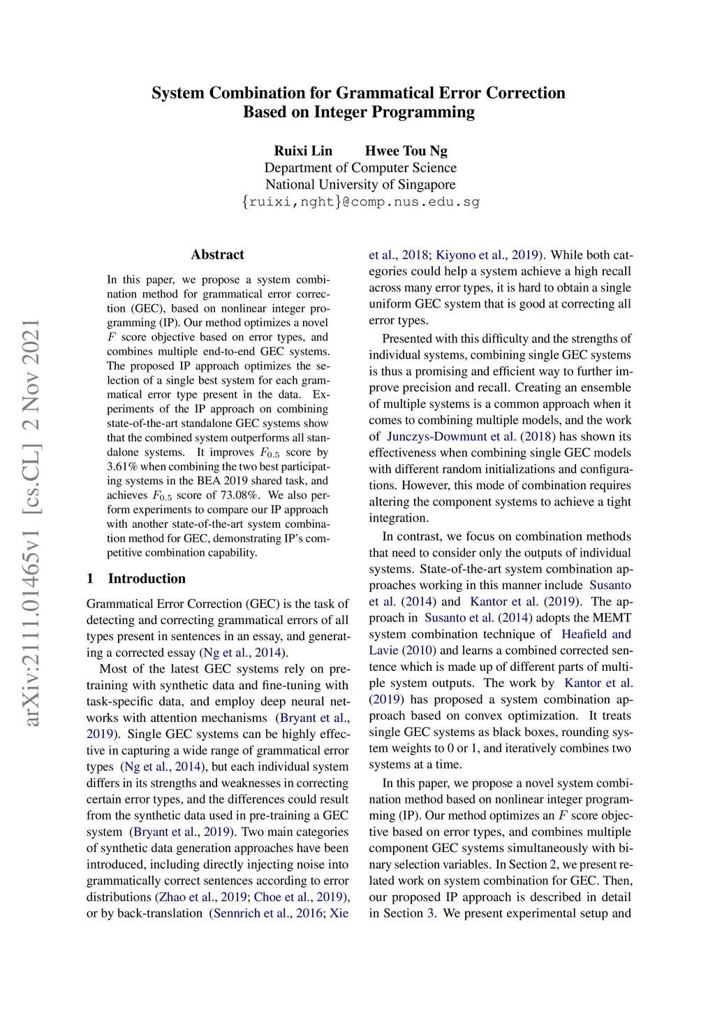 In this paper, we propose a system combination method for grammatical error correction (GEC), based on nonlinear integer programming (IP). Our method optimizes a novel F score objective based on error types, and combines multiple end-to-end GEC systems. The proposed IP approach optimizes the selection of a single best system for each grammatical error type present in the data. Experiments of the IP approach on combining state-of-the-art standalone GEC systems show that the combined system outperforms all standalone systems. It improves F0.5 score by 3.61% when combining the two best participating systems in the BEA 2019 shared task, and achieves F0.5 score of 73.08%. We also perform experiments to compare our IP approach with another state-of-the-art system combination method for GEC, demonstrating IP's competitive combination capability.