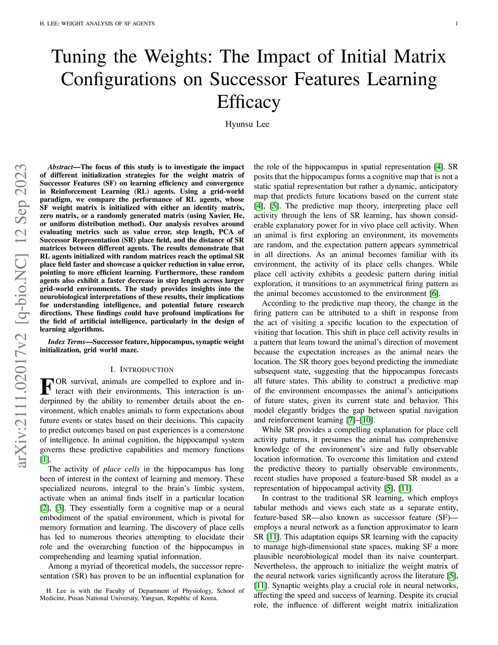 The focus of this study is to investigate the impact of different initialization strategies for the weight matrix of Successor Features (SF) on learning efficiency and convergence in Reinforcement Learning (RL) agents. Using a grid-world paradigm, we compare the performance of RL agents, whose SF weight matrix is initialized with either an identity matrix, zero matrix, or a randomly generated matrix (using Xavier, He, or uniform distribution method). Our analysis revolves around evaluating metrics such as value error, step length, PCA of Successor Representation (SR) place field, and the distance of SR matrices between different agents. The results demonstrate that RL agents initialized with random matrices reach the optimal SR place field faster and showcase a quicker reduction in value error, pointing to more efficient learning. Furthermore, these random agents also exhibit a faster decrease in step length across larger grid-world environments. The study provides insights into the neurobiological interpretations of these results, their implications for understanding intelligence, and potential future research directions. These findings could have profound implications for the field of artificial intelligence, particularly in the design of learning algorithms.
