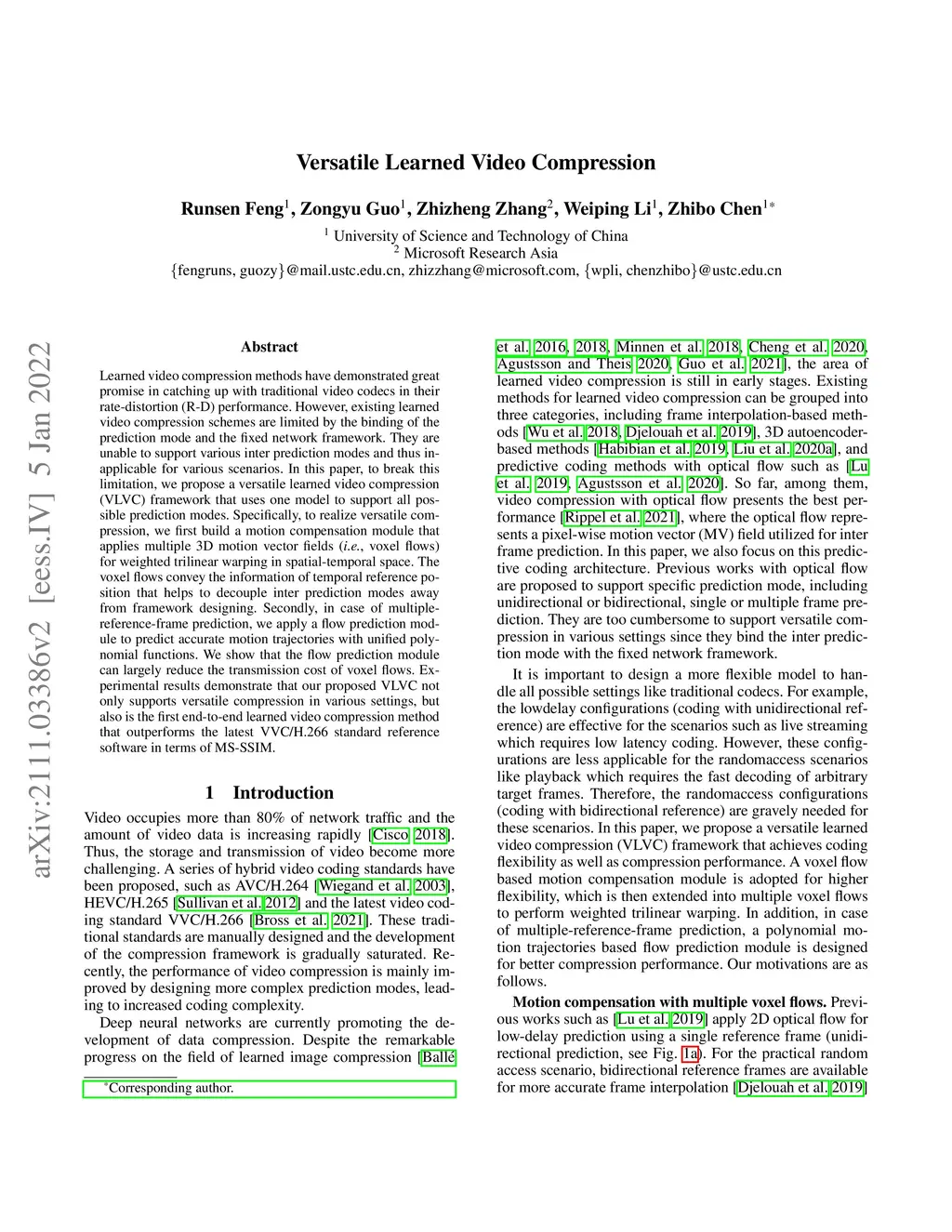 Learned video compression methods have demonstrated great promise in catching up with traditional video codecs in their rate-distortion (R-D) performance. However, existing learned video compression schemes are limited by the binding of the prediction mode and the fixed network framework. They are unable to support various inter prediction modes and thus inapplicable for various scenarios. In this paper, to break this limitation, we propose a versatile learned video compression (VLVC) framework that uses one model to support all possible prediction modes. Specifically, to realize versatile compression, we first build a motion compensation module that applies multiple 3D motion vector fields (i.e., voxel flows) for weighted trilinear warping in spatial-temporal space. The voxel flows convey the information of temporal reference position that helps to decouple inter prediction modes away from framework designing. Secondly, in case of multiple-reference-frame prediction, we apply a flow prediction module to predict accurate motion trajectories with unified polynomial functions. We show that the flow prediction module can largely reduce the transmission cost of voxel flows. Experimental results demonstrate that our proposed VLVC not only supports versatile compression in various settings, but also is the first end-to-end learned video compression method that outperforms the latest VVC/H.266 standard reference software in terms of MS-SSIM.